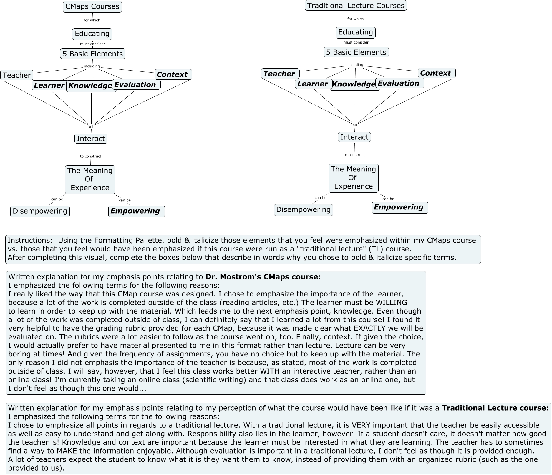 This Concept Map, created with IHMC CmapTools, has information related to: ReAnna Gibbs CMaps vs TL, The Meaning Of Experience can be Disempowering, Knowledge all Evaluation, Knowledge all Interact, 5 Basic Elements including Evaluation, Educating must consider 5 Basic Elements, Interact to construct The Meaning Of Experience, The Meaning Of Experience can be Empowering, CMaps Courses for which Educating, Interact to construct The Meaning Of Experience, Knowledge all Learner, 5 Basic Elements including Context, Knowledge all Teacher, 5 Basic Elements including Context, Knowledge all Interact, 5 Basic Elements including Learner, Knowledge all Learner, Knowledge all Context, Traditional Lecture Courses for which Educating, 5 Basic Elements including Learner, 5 Basic Elements including Evaluation