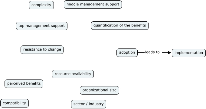 This Concept Map, created with IHMC CmapTools, has information related to: research model, adoption leads to implementation