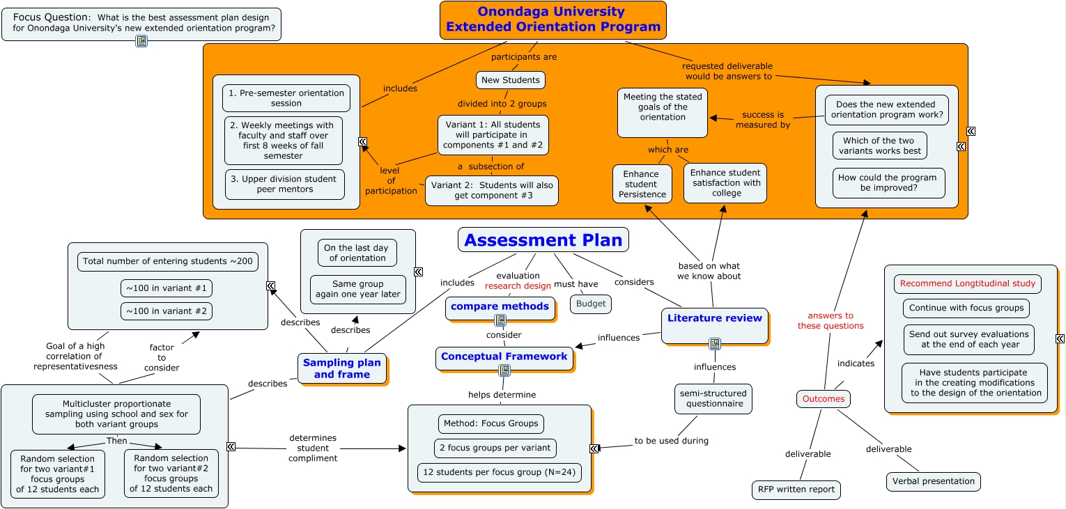 This Concept Map, created with IHMC CmapTools, has information related to: Extended Orientation Program-version 3, Meeting the stated goals of the orientation which are Enhance student satisfaction with college, Onondaga University Extended Orientation Program participants are New Students, Assessment Plan must have Budget, Meeting the stated goals of the orientation which are Enhance student Persistence, Outcomes indicates Next Steps, Does the new extended orientation program work? success is measured by Meeting the stated goals of the orientation, Onondaga University Extended Orientation Program includes Components of the Orientation, Literature review based on what we know about Enhance student satisfaction with college, Conceptual Framework helps determine Qualitative Method: Focus Groups, Onondaga University Extended Orientation Program requested deliverable would be answers to Key Questions, Outcomes deliverable Verbal presentation, compare methods consider Conceptual Framework, semi-structured questionnaire to be used during Qualitative Method: Focus Groups, Assessment Plan considers Literature review, Sampling plan and frame describes When?, Variant 2: Students will also get component #3 level of participation Components of the Orientation, Literature review based on what we know about Enhance student Persistence, Literature review influences semi-structured questionnaire, Representativeness (Who?) factor to consider How many students in total?, Sampling plan and frame describes How many students in total?