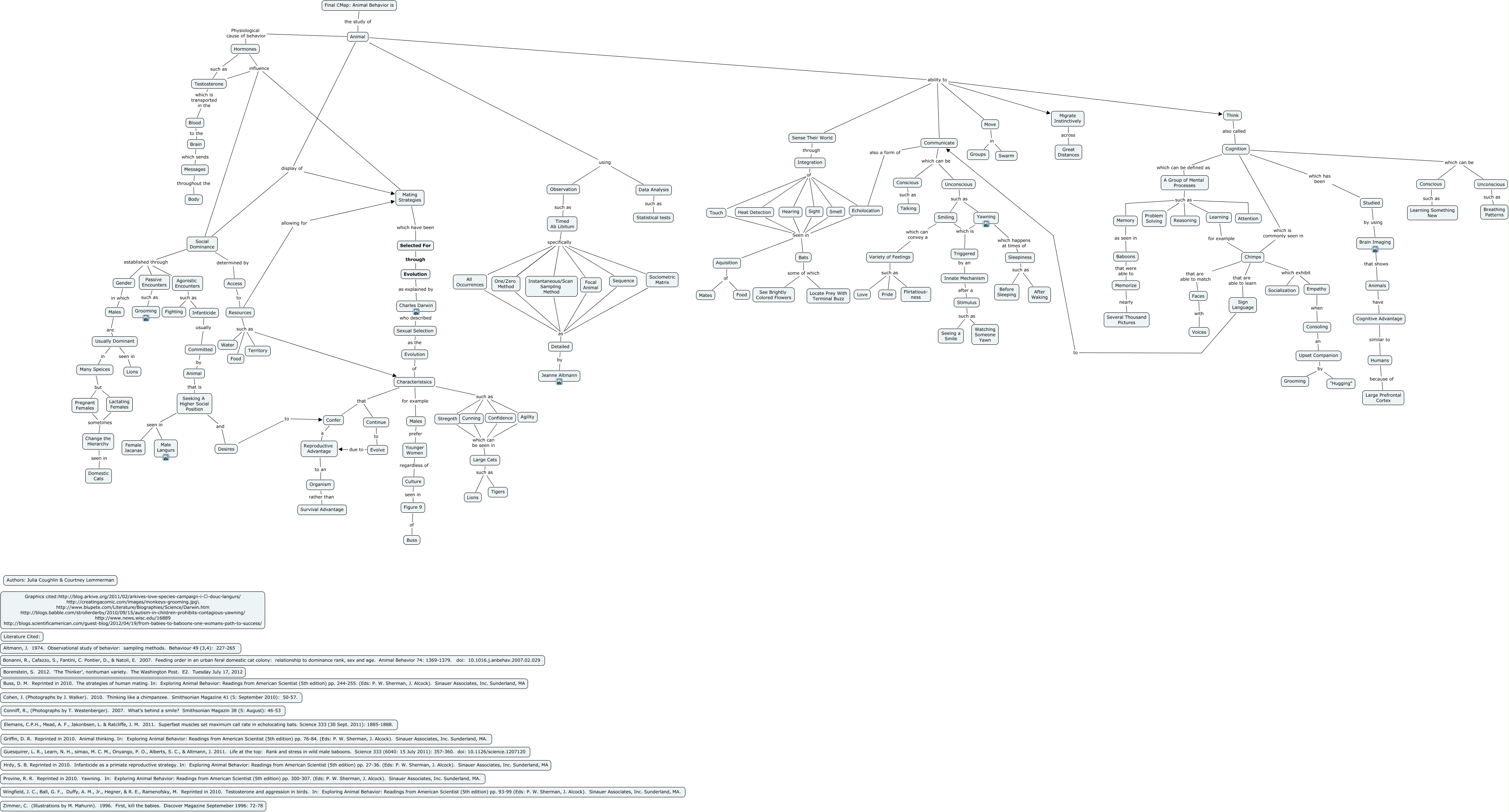This Concept Map, created with IHMC CmapTools, has information related to: Coughlin Lemmerman What is Animal Behavior - Final, Stregnth which can be seen in Large Cats, A Group of Mental Processes such as Problem Solving, Timed Ab Libitum specifically Sequence, Yawning which happens at times of Sleepiness, Committed by Animal, Integration of Smell, Desires to Confer, Agonistic Encounters such as Infanticide, A Group of Mental Processes such as Reasoning, Animal ability to Move, Heat Detection Seen in Aquisition, Smell Seen in Bats, A Group of Mental Processes such as Learning, Animal ability to Sense Their World, Think also called Cognition, Bats some of which See Brightly Colored Flowers, Communicate also a form of Echolocation, Smell Seen in Aquisition, Stimulus such as Seeing a Smile, Usually Dominant seen in Lions