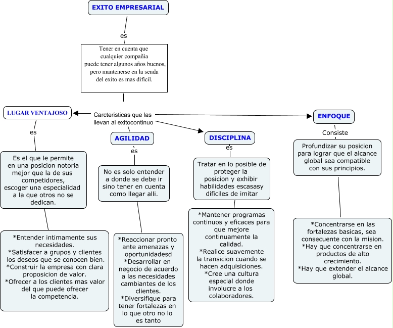 Este Cmap, tiene información relacionada con: Actividad 7 comunicacion escrita, Tener en cuenta que cualquier compañia puede tener algunos años buenos, pero mantenerse en la senda del exito es mas dificil. Carcteristicas que las llevan al exitocontinuo ENFOQUE, Tratar en lo posible de proteger la posicion y exhibir habilidades escasasy dificiles de imitar ???? *Mantener programas continuos y eficaces para que mejore continuamente la calidad. *Realice suavemente la transicion cuando se hacen adquisiciones. *Cree una cultura especial donde involucre a los colaboradores., DISCIPLINA es Tratar en lo posible de proteger la posicion y exhibir habilidades escasasy dificiles de imitar, No es solo entender a donde se debe ir sino tener en cuenta como llegar alli. ???? *Reaccionar pronto ante amenazas y oportunidadesd *Desarrollar en negocio de acuerdo a las necesidades cambiantes de los clientes. *Diversifique para tener fortalezas en lo que otro no lo es tanto, LUGAR VENTAJOSO es ????, Tener en cuenta que cualquier compañia puede tener algunos años buenos, pero mantenerse en la senda del exito es mas dificil. Carcteristicas que las llevan al exitocontinuo LUGAR VENTAJOSO, Tener en cuenta que cualquier compañia puede tener algunos años buenos, pero mantenerse en la senda del exito es mas dificil. Carcteristicas que las llevan al exitocontinuo AGILIDAD, Profundizar su posicion para lograr que el alcance global sea compatible con sus principios. ???? *Concentrarse en las fortalezas basicas, sea consecuente con la mision. *Hay que concentrarse en productos de alto crecimiento. *Hay que extender el alcance global., AGILIDAD es No es solo entender a donde se debe ir sino tener en cuenta como llegar alli., Es el que le permite en una posicion notoria mejor que la de sus competidores, escoger una especialidad a la que otros no se dedican. ???? *Entender intimamente sus necesidades. *Satisfacer a grupos y clientes los deseos que se conocen bien. *Construir la empresa con clara proposicion de valor. *Ofrecer a los clientes mas valor del que puede ofrecer la competencia., EXITO EMPRESARIAL es Tener en cuenta que cualquier compañia puede tener algunos años buenos, pero mantenerse en la senda del exito es mas dificil., Tener en cuenta que cualquier compañia puede tener algunos años buenos, pero mantenerse en la senda del exito es mas dificil. Carcteristicas que las llevan al exitocontinuo DISCIPLINA, ENFOQUE Consiste Profundizar su posicion para lograr que el alcance global sea compatible con sus principios.