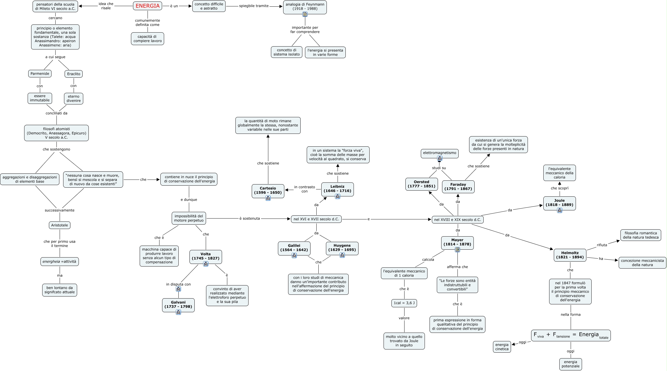 Questa Cmap, creata con IHMC CmapTools, contiene informazioni relative a: energia, <math xmlns="http://www.w3.org/1998/Math/MathML"> <mrow> <mmultiscripts> <mtext> F </mtext> <mtext> viva </mtext> <none/> </mmultiscripts> <mtext> + </mtext> <mmultiscripts> <mtext> F </mtext> <mtext> tensione </mtext> <none/> </mmultiscripts> <mtext> = </mtext> <mmultiscripts> <mtext> Energia </mtext> <mtext> totale </mtext> <none/> </mmultiscripts> </mrow> </math> oggi energia cinetica, contiene in nuce il principio di conservazione dell'energia e dunque impossibilità del motore perpetuo, Aristotele che per primo usa il termine energheia=attività, “nessuna cosa nasce e muore, bensì si mescola e si separa di nuovo da cose esistenti” che contiene in nuce il principio di conservazione dell'energia, nel XVIII e XIX secolo d.C. da Faraday (1791 - 1867), filosofi atomisti (Democrito, Anassagora, Epicuro) V secolo a.C. che sostengono aggregazioni e disaggregazioni di elementi base, Cartesio (1596 - 1650) che sostiene la quantità di moto rimane globalmente la stessa, nonostante variabile nelle sue parti, nel XVI e XVII secolo d.C. da Huygens (1629 - 1695), filosofi atomisti (Democrito, Anassagora, Epicuro) V secolo a.C. che sostengono “nessuna cosa nasce e muore, bensì si mescola e si separa di nuovo da cose esistenti”, nel XVI e XVII secolo d.C. da Galilei (1564 - 1642), Galilei (1564 - 1642) che con i loro studi di meccanica danno un'importante contributo nell'affermazione del principio di conservazione dell'energia, ENERGIA è un concetto difficile e astratto, pensatori della scuola di Mileto VI secolo a.C. cercano principio o elemento fondamentale, una sola sostanza (Talete: acqua Anassimandro: apeiron Anassimene: aria), nel XVIII e XIX secolo d.C. da Oersted (1777 - 1851), Parmenide con essere immutabile, Eraclito con eterno divenire, 1cal = 3,6 J valore molto vicino a quello trovato da Joule in seguito, Faraday (1791 - 1867) studi su elettromagnetismo, energheia=attività ma ben lontano da signifcato attuale, eterno divenire concliliati da filosofi atomisti (Democrito, Anassagora, Epicuro) V secolo a.C.