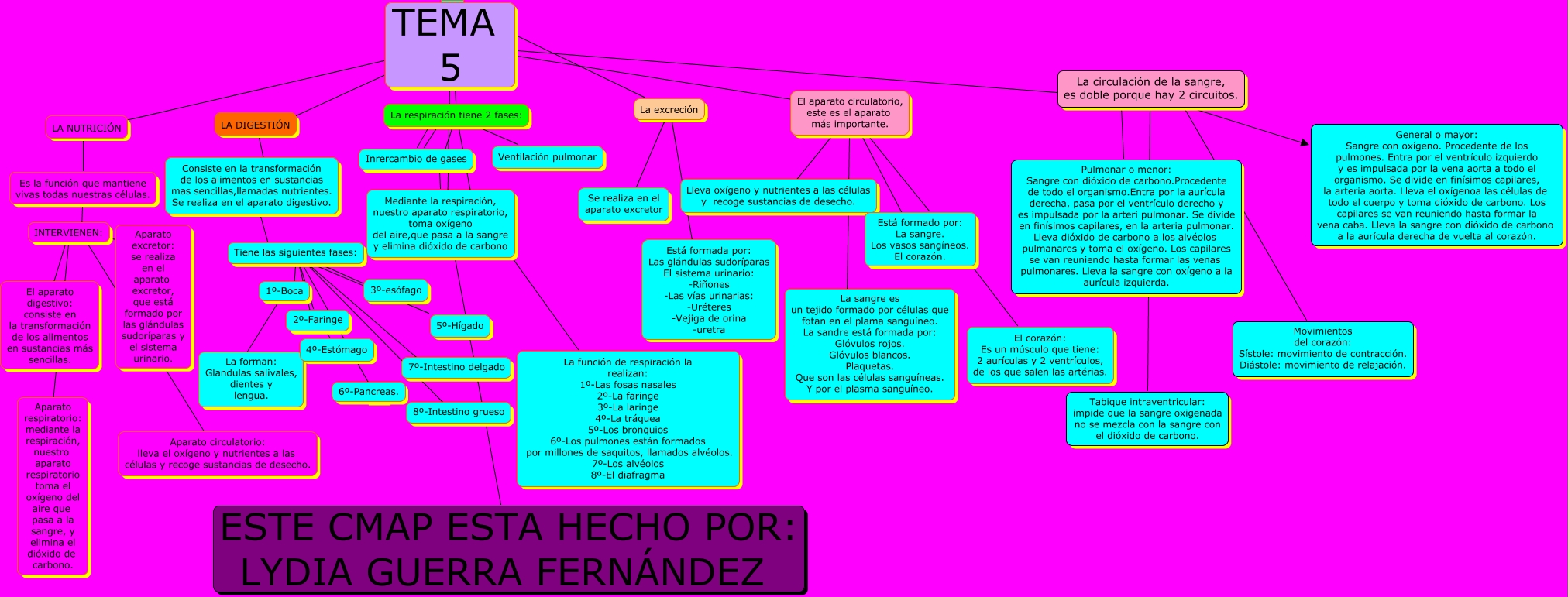 Este Cmap, tiene información relacionada con: cono tema 5 la nutrición hecho por lydia guerra fernandez, TEMA 5 ???? La excreción, La circulación de la sangre, es doble porque hay 2 circuitos. General o mayor: Sangre con oxígeno. Procedente de los pulmones. Entra por el ventrículo izquierdo y es impulsada por la vena aorta a todo el organismo. Se divide en finísimos capilares, la arteria aorta. Lleva el oxígenoa las células de todo el cuerpo y toma dióxido de carbono. Los capilares se van reuniendo hasta formar la vena caba. Lleva la sangre con dióxido de carbono a la aurícula derecha de vuelta al corazón., Tiene las siguientes fases: ???? 6º-Pancreas., TEMA 5 ???? El aparato circulatorio, este es el aparato más importante., El aparato circulatorio, este es el aparato más importante. ???? Lleva oxígeno y nutrientes a las células y recoge sustancias de desecho., El aparato circulatorio, este es el aparato más importante. ???? Está formado por: La sangre. Los vasos sangíneos. El corazón., La excreción ???? Se realiza en el aparato excretor, TEMA 5 ???? LA DIGESTIÓN, La respiración tiene 2 fases: ???? Ventilación pulmonar, LA NUTRICIÓN ???? Es la función que mantiene vivas todas nuestras células., La circulación de la sangre, es doble porque hay 2 circuitos. ???? Movimientos del corazón: Sístole: movimiento de contracción. Diástole: movimiento de relajación., Tiene las siguientes fases: ???? 4º-Estómago, La circulación de la sangre, es doble porque hay 2 circuitos. Pulmonar o menor: Sangre con dióxido de carbono.Procedente de todo el organismo.Entra por la aurícula derecha, pasa por el ventrículo derecho y es impulsada por la arteri pulmonar. Se divide en finísimos capilares, en la arteria pulmonar. Lleva dióxido de carbono a los alvéolos pulmanares y toma el oxígeno. Los capilares se van reuniendo hasta formar las venas pulmonares. Lleva la sangre con oxígeno a la aurícula izquierda., TEMA 5 ???? La circulación de la sangre, es doble porque hay 2 circuitos., INTERVIENEN: ???? Aparato excretor: se realiza en el aparato excretor, que está formado por las glándulas sudoríparas y el sistema urinario., La respiración tiene 2 fases: ???? Mediante la respiración, nuestro aparato respiratorio, toma oxígeno del aire,que pasa a la sangre y elimina dióxido de carbono, Tiene las siguientes fases: ???? 1º-Boca, La respiración tiene 2 fases: ???? La función de respiración la realizan: 1º-Las fosas nasales 2º-La faringe 3º-La laringe 4º-La tráquea 5º-Los bronquios 6º-Los pulmones están formados por millones de saquitos, llamados alvéolos. 7º-Los alvéolos 8º-El diafragma, 1º-Boca ???? La forman: Glandulas salivales, dientes y lengua., Consiste en la transformación de los alimentos en sustancias mas sencillas,llamadas nutrientes. Se realiza en el aparato digestivo. ???? Tiene las siguientes fases: