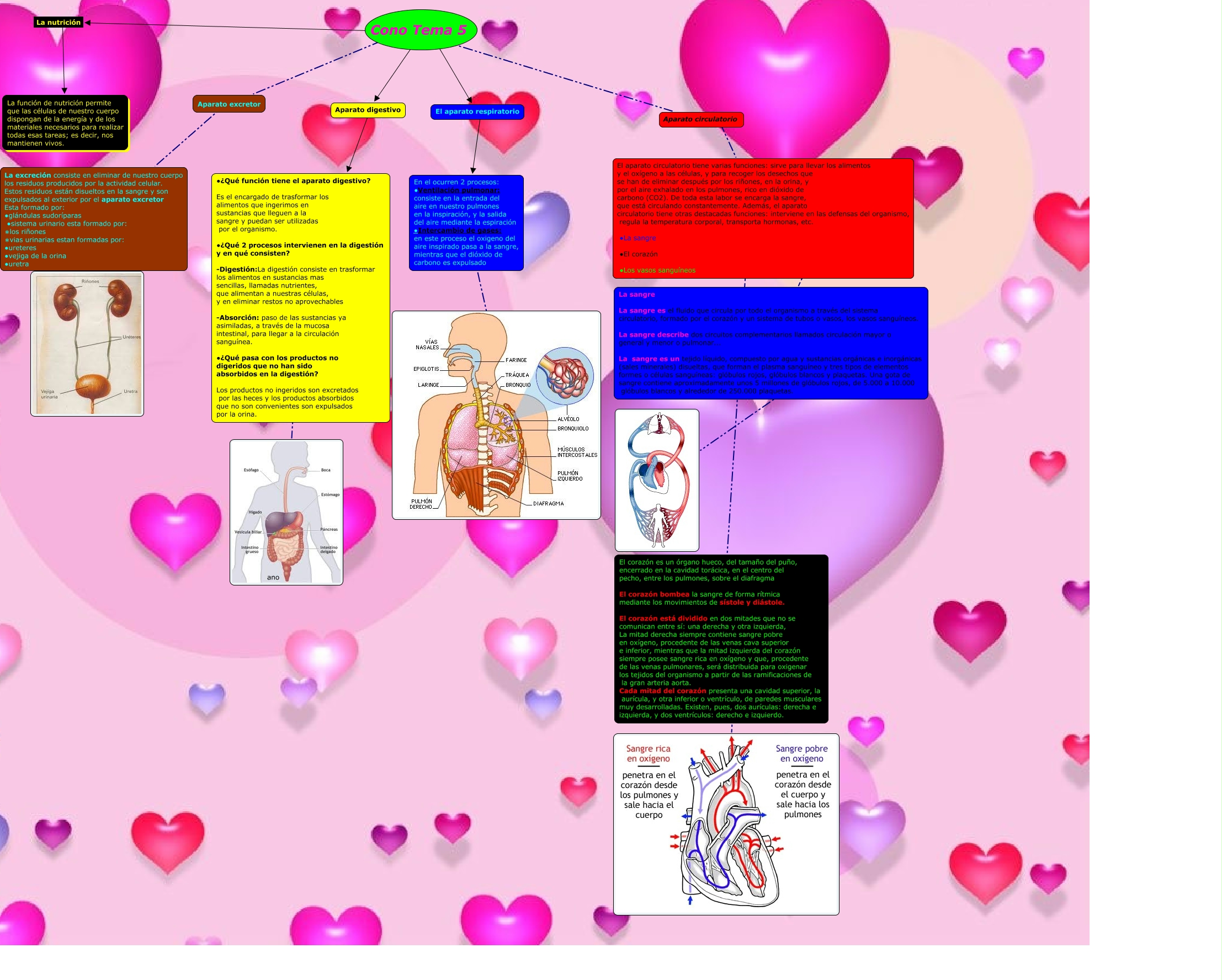 Este Cmap, tiene información relacionada con: Tema 5 la nutrición Valeria, La sangre La sangre es el fluido que circula por todo el organismo a través del sistema circulatorio, formado por el corazón y un sistema de tubos o vasos, los vasos sanguíneos. La sangre describe dos circuitos complementarios llamados circulación mayor o general y menor o pulmonar... La sangre es un tejido líquido, compuesto por agua y sustancias orgánicas e inorgánicas (sales minerales) disueltas, que forman el plasma sanguíneo y tres tipos de elementos formes o células sanguíneas: glóbulos rojos, glóbulos blancos y plaquetas. Una gota de sangre contiene aproximadamente unos 5 millones de glóbulos rojos, de 5.000 a 10.000 glóbulos blancos y alrededor de 250.000 plaquetas. ????, Aparato circulatorio El aparato circulatorio tiene varias funciones: sirve para llevar los alimentos y el oxígeno a las células, y para recoger los desechos que se han de eliminar después por los riñones, en la orina, y por el aire exhalado en los pulmones, rico en dióxido de carbono (CO2). De toda esta labor se encarga la sangre, que está circulando constantemente. Además, el aparato circulatorio tiene otras destacadas funciones: interviene en las defensas del organismo, regula la temperatura corporal, transporta hormonas, etc. ∙La sangre ∙El corazón ∙Los vasos sanguíneos, La excreción consiste en eliminar de nuestro cuerpo los residuos producidos por la actividad celular. Estos residuos están disueltos en la sangre y son expulsados al exterior por el aparato excretor Esta formado por: ∙glándulas sudoríparas ∙sistema urinario esta formado por: ∗los riñones ∗vias urinarias estan formadas por: ∙ureteres ∙vejiga de la orina ∙uretra ????, Cono Tema 5 ???? Aparato excretor, El aparato circulatorio tiene varias funciones: sirve para llevar los alimentos y el oxígeno a las células, y para recoger los desechos que se han de eliminar después por los riñones, en la orina, y por el aire exhalado en los pulmones, rico en dióxido de carbono (CO2). De toda esta labor se encarga la sangre, que está circulando constantemente. Además, el aparato circulatorio tiene otras destacadas funciones: interviene en las defensas del organismo, regula la temperatura corporal, transporta hormonas, etc. ∙La sangre ∙El corazón ∙Los vasos sanguíneos ???? La sangre La sangre es el fluido que circula por todo el organismo a través del sistema circulatorio, formado por el corazón y un sistema de tubos o vasos, los vasos sanguíneos. La sangre describe dos circuitos complementarios llamados circulación mayor o general y menor o pulmonar... La sangre es un tejido líquido, compuesto por agua y sustancias orgánicas e inorgánicas (sales minerales) disueltas, que forman el plasma sanguíneo y tres tipos de elementos formes o células sanguíneas: glóbulos rojos, glóbulos blancos y plaquetas. Una gota de sangre contiene aproximadamente unos 5 millones de glóbulos rojos, de 5.000 a 10.000 glóbulos blancos y alrededor de 250.000 plaquetas., Cono Tema 5 ???? Aparato digestivo, La nutrición ???? La función de nutrición permite que las células de nuestro cuerpo dispongan de la energía y de los materiales necesarios para realizar todas esas tareas; es decir, nos mantienen vivos., Cono Tema 5 ???? El aparato respiratorio, Cono Tema 5 ???? La nutrición, El aparato circulatorio tiene varias funciones: sirve para llevar los alimentos y el oxígeno a las células, y para recoger los desechos que se han de eliminar después por los riñones, en la orina, y por el aire exhalado en los pulmones, rico en dióxido de carbono (CO2). De toda esta labor se encarga la sangre, que está circulando constantemente. Además, el aparato circulatorio tiene otras destacadas funciones: interviene en las defensas del organismo, regula la temperatura corporal, transporta hormonas, etc. ∙La sangre ∙El corazón ∙Los vasos sanguíneos ???? El corazón es un órgano hueco, del tamaño del puño, encerrado en la cavidad torácica, en el centro del pecho, entre los pulmones, sobre el diafragma El corazón bombea la sangre de forma rítmica mediante los movimientos de sístole y diástole. El corazón está dividido en dos mitades que no se comunican entre sí: una derecha y otra izquierda, La mitad derecha siempre contiene sangre pobre en oxígeno, procedente de las venas cava superior e inferior, mientras que la mitad izquierda del corazón siempre posee sangre rica en oxígeno y que, procedente de las venas pulmonares, será distribuida para oxigenar los tejidos del organismo a partir de las ramificaciones de la gran arteria aorta. Cada mitad del corazón presenta una cavidad superior, la aurícula, y otra inferior o ventrículo, de paredes musculares muy desarrolladas. Existen, pues, dos aurículas: derecha e izquierda, y dos ventrículos: derecho e izquierdo., Aparato excretor t La excreción consiste en eliminar de nuestro cuerpo los residuos producidos por la actividad celular. Estos residuos están disueltos en la sangre y son expulsados al exterior por el aparato excretor Esta formado por: ∙glándulas sudoríparas ∙sistema urinario esta formado por: ∗los riñones ∗vias urinarias estan formadas por: ∙ureteres ∙vejiga de la orina ∙uretra, El aparato respiratorio ???? En el ocurren 2 procesos: ∙Ventilación pulmonar: consiste en la entrada del aire en nuestro pulmones en la inspiración, y la salida del aire mediante la espiración ∙Intercambio de gases: en este proceso el oxigeno del aire inspirado pasa a la sangre, mientras que el dióxido de carbono es expulsado, Aparato digestivo ???? ∙¿Qué función tiene el aparato digestivo? Es el encargado de trasformar los alimentos que ingerimos en sustancias que lleguen a la sangre y puedan ser utilizadas por el organismo. ∙¿Qué 2 procesos intervienen en la digestión y en qué consisten? -Digestión:La digestión consiste en trasformar los alimentos en su