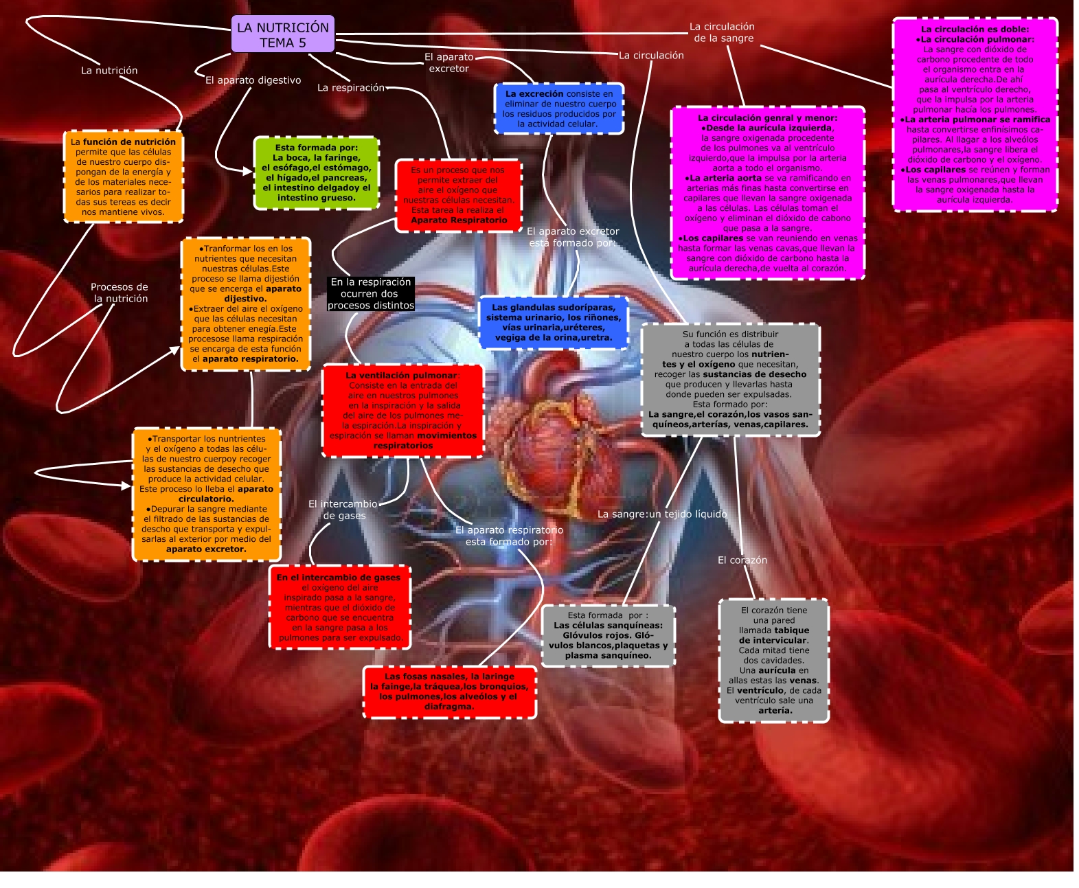 Este Cmap, tiene información relacionada con: tema 5 cono andres, Su función es distribuir a todas las células de nuestro cuerpo los nutrien- tes y el oxígeno que necesitan, recoger las sustancias de desecho que producen y llevarlas hasta donde pueden ser expulsadas. Esta formado por: La sangre,el corazón,los vasos san- quíneos,arterías, venas,capilares. La sangre:un tejido líquido Esta formada por : Las células sanquíneas: Glóvulos rojos. Gló- vulos blancos,plaquetas y plasma sanquíneo., Es un proceso que nos permite extraer del aire el oxígeno que nuestras células necesitan. Esta tarea la realiza el Aparato Respiratorio En la respiración ocurren dos procesos distintos La ventilación pulmonar: Consiste en la entrada del aire en nuestros pulmones en la inspiración y la salida del aire de los pulmones me- la espiración.La inspiración y espiración se llaman movimientos respiratorios, La excreción consiste en eliminar de nuestro cuerpo los residuos producidos por la actividad celular. El aparato excretor está formado por: Las glandulas sudoríparas, sistema urinario, los riñones, vías urinaria,uréteres, vegiga de la orina,uretra., Su función es distribuir a todas las células de nuestro cuerpo los nutrien- tes y el oxígeno que necesitan, recoger las sustancias de desecho que producen y llevarlas hasta donde pueden ser expulsadas. Esta formado por: La sangre,el corazón,los vasos san- quíneos,arterías, venas,capilares. El corazón El corazón tiene una pared llamada tabique de intervicular. Cada mitad tiene dos cavidades. Una aurícula en allas estas las venas. El ventrículo, de cada ventrículo sale una artería., La función de nutrición permite que las células de nuestro cuerpo dis- pongan de la energía y de los materiales nece- sarios para realizar to- das sus tereas es decir nos mantiene vivos. Procesos de la nutrición ∙Tranformar los en los nutrientes que necesitan nuestras células.Este proceso se llama dijestión que se encerga el aparato dijestivo. ∙Extraer del aire el oxígeno que las células necesitan para obtener enegía.Este procesose llama respiración se encarga de esta función el aparato respiratorio., LA NUTRICIÓN TEMA 5 El aparato excretor La excreción consiste en eliminar de nuestro cuerpo los residuos producidos por la actividad celular., LA NUTRICIÓN TEMA 5 La respiración Es un proceso que nos permite extraer del aire el oxígeno que nuestras células necesitan. Esta tarea la realiza el Aparato Respiratorio, LA NUTRICIÓN TEMA 5 La circulación de la sangre La circulación genral y menor: ∙Desde la aurícula izquierda, la sangre oxigenada procedente de los pulmones va al ventrículo izquierdo,que la impulsa por la arteria aorta a todo el organismo. ∙La arteria aorta se va ramificando en arterias más finas hasta convertirse en capilares que llevan la sangre oxigenada a las células. Las células toman el oxígeno y eliminan el dióxido de cabono que pasa a la sangre. ∙Los capilares se van reuniendo en venas hasta formar las venas cavas,que llevan la sangre con dióxido de carbono hasta la aurícula derecha,de vuelta al corazón., LA NUTRICIÓN TEMA 5 El aparato digestivo Esta formada por: La boca, la faringe, el esófago,el estómago, el hígado,el pancreas, el intestino delgadoy el intestino grueso., LA NUTRICIÓN TEMA 5 La circulación de la sangre La circulación es doble: ∙La circulación pulmonar: La sangre con dióxido de carbono procedente de todo el organismo entra en la aurícula derecha.De ahí pasa al ventrículo derecho, que la impulsa por la arteria pulmonar hacía los pulmones. ∙La arteria pulmonar se ramifica hasta convertirse enfinísimos ca- pilares. Al llagar a los alveólos pulmonares,la sangre libera el dióxido de carbono y el oxígeno. ∙Los capilares se reúnen y forman las venas pulmonares,que llevan la sangre oxigenada hasta la aurícula izquierda., LA NUTRICIÓN TEMA 5 La nutrición La función de nutrición permite que las células de nuestro cuerpo dis- pongan de la energía y de los materiales nece- sarios para realizar to- das sus tereas es decir nos mantiene vivos., La ventilación pulmonar: Consiste en la entrada del aire en nuestros pulmones en la inspiración y la salida del aire de los pulmones me- la espiración.La inspiración y espiración se llaman movimientos respiratorios El aparato respiratorio esta formado por: Las fosas nasales, la laringe la fainge,la tráquea,los bronquios, los pulmones,los alveólos y el diafragma., LA NUTRICIÓN TEMA 5 La circulación ????, ∙Tranformar los en los nutrientes que necesitan nuestras células.Este proceso se llama dijestión que se encerga el aparato dijestivo. ∙Extraer del aire el oxígeno que las células necesitan para obtener enegía.Este procesose llama respiración se encarga de esta función el aparato respiratorio. ???? ∙Transportar los nuntrientes y el oxígeno a todas las célu- las de nuestro cuerpoy recoger las sustancias de desecho que produce la actividad celular. Este proceso lo lleba el aparato circulatorio. ∙Depurar la sangre mediante el filtrado de las sustancias de descho que transporta y expul- sarlas al exterior por medio del aparato excretor., La ventilación pulmonar: Consiste en la entrada del aire en nuestros pulmones en la inspiración y la salida del aire de los pulmones me- la espiración.La inspiración y espiración se llaman movimientos respiratorios El intercambio de gases En el intercambio de gases el oxígeno del aire inspirado pasa a la sangre, mientras que el dióxido de carbono que se encuentra en la sangre pasa a los pulmones para ser expulsado.