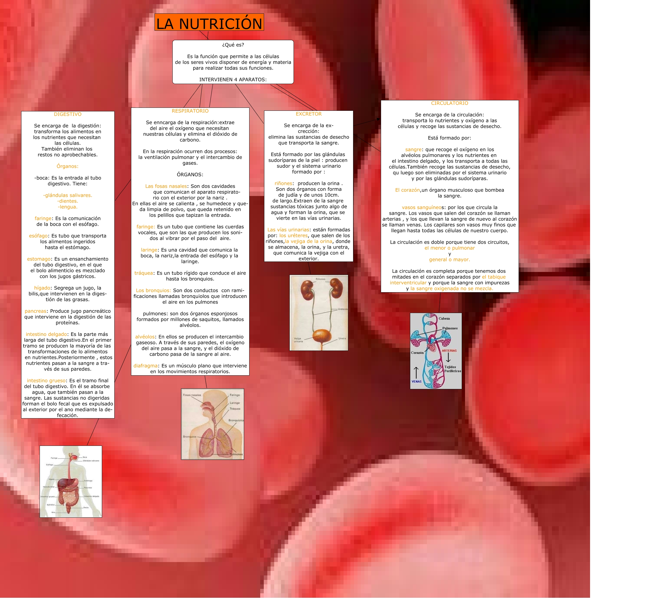 Este Cmap, tiene información relacionada con: coni tema 5, ¿Qué es? Es la función que permite a las células de los seres vivos disponer de energía y materia para realizar todas sus funciones. INTERVIENEN 4 APARATOS: ???? CIRCULATORIO Se encarga de la circulación: transporta lo nutrientes y oxígeno a las células y recoge las sustancias de desecho. Está formado por: sangre: que recoge el oxígeno en los alvéolos pulmonares y los nutrientes en el intestino delgado, y los transporta a todas las células.También recoge las sustancias de desecho, qu luego son eliminadas por el sistema urinario y por las glándulas sudoríparas. El corazón,un órgano musculoso que bombea la sangre. vasos sanguíneos: por los que circula la sangre. Los vasos que salen del corazón se llaman arterias , y los que llevan la sangre de nuevo al corazón se llaman venas. Los capilares son vasos muy finos que llegan hasta todas las células de nuestro cuerpo. La circulación es doble porque tiene dos circuitos, el menor o pulmonar y general o mayor. La circulación es completa porque tenemos dos mitades en el corazón separados por el tabique interventricular y porque la sangre con impurezas y la sangre oxigenada no se mezcla., ¿Qué es? Es la función que permite a las células de los seres vivos disponer de energía y materia para realizar todas sus funciones. INTERVIENEN 4 APARATOS: ???? CIRCULATORIO Se encarga de la circulación: transporta lo nutrientes y oxígeno a las células y recoge las sustancias de desecho. Está formado por: sangre: que recoge el oxígeno en los alvéolos pulmonares y los nutrientes en el intestino delgado, y los transporta a todas las células.También recoge las sustancias de desecho, qu luego son eliminadas por el sistema urinario y por las glándulas sudoríparas. El corazón,un órgano musculoso que bombea la sangre. vasos sanguíneos: por los que circula la sangre. Los vasos que salen del corazón se llaman arterias , y los que llevan la sangre de nuevo al corazón se llaman venas. Los capilares son vasos muy finos que llegan hasta todas las células de nuestro cuerpo. La circulación es doble porque tiene dos circuitos, el menor o pulmonar y general o mayor. La circulación es completa porque tenemos dos mitades en el corazón separados por el tabique interventricular y porque la sangre con impurezas y la sangre oxigenada no se mezcla., LA NUTRICIÓN ????, EXCRETOR Se encarga de la ex- crección: elimina las sustancias de desecho que transporta la sangre. Está formado por las glándulas sudoríparas de la piel : producen sudor y el sistema urinario formado por : riñones: producen la orina . Son dos órganos con forma de judía y de unos 10cm. de largo.Extraen de la sangre sustancias tóxicas junto algo de agua y forman la orina, que se vierte en las vías urinarias. Las vías urinarias: están formadas por: los uréteres, que salen de los riñones,la vejiga de la orina, donde se almacena, la orina, y la uretra, que comunica la vejiga con el exterior. ????, ¿Qué es? Es la función que permite a las células de los seres vivos disponer de energía y materia para realizar todas sus funciones. INTERVIENEN 4 APARATOS: ???? EXCRETOR Se encarga de la ex- crección: elimina las sustancias de desecho que transporta la sangre. Está formado por las glándulas sudoríparas de la piel : producen sudor y el sistema urinario formado por : riñones: producen la orina . Son dos órganos con forma de judía y de unos 10cm. de largo.Extraen de la sangre sustancias tóxicas junto algo de agua y forman la orina, que se vierte en las vías urinarias. Las vías urinarias: están formadas por: los uréteres, que salen de los riñones,la vejiga de la orina, donde se almacena, la orina, y la uretra, que comunica la vejiga con el exterior., ¿Qué es? Es la función que permite a las células de los seres vivos disponer de energía y materia para realizar todas sus funciones. INTERVIENEN 4 APARATOS: ???? RESPIRATORIO Se enncarga de la respiración:extrae del aire el oxígeno que necesitan nuestras células y elimina el dióxido de carbono. En la respiración ocurren dos procesos: la ventilación pulmonar y el intercambio de gases. ÓRGANOS: Las fosas nasales: Son dos cavidades que comunican el aparato respirato- rio con el exterior por la nariz . En ellas el aire se calienta , se humedece y que- da limpia de polvo, que queda retenido en los pelillos que tapizan la entrada. faringe: Es un tubo que contiene las cuerdas vocales, que son las que producen los soni- dos al vibrar por el paso del aire. laringe: Es una cavidad que comunica la boca, la nariz,la entrada del esófago y la laringe. tráquea: Es un tubo rígido que conduce el aire hasta los bronquios. Los bronquios: Son dos conductos con rami- ficaciones llamadas bronquiolos que introducen el aire en los pulmones pulmones: son dos órganos esponjosos formados por millones de saquitos, llamados alvéolos. alvéolos: En ellos se producen el intercambio gaseoso. A través de sus paredes, el oxígeno del aire pasa a la sangre, y el dióxido de carbono pasa de la sangre al aire. diafragma: Es un músculo plano que interviene en los movimientos respiratorios., ???? RESPIRATORIO Se enncarga de la respiración:extrae del aire el oxígeno que necesitan nuestras células y elimina el dióxido de carbono. En la respiración ocurren dos procesos: la ventilación pulmonar y el intercambio de gases. ÓRGANOS: Las fosas nasales: Son dos cavidades que comunican el aparato respirato- rio con el exterior por la nariz . En ellas el aire se calienta , se humedece y que- da limpia de polvo, que queda retenido en los pelillos que tapizan la entrada. faringe: Es un tubo que contiene las cuerdas vocales, que son las que producen los soni- dos al vibrar por el paso del aire. laringe: Es una cavidad que comunica la boca, la nariz,la entrada del esófago y la laringe. tráquea: Es un tubo rígido que conduce el aire hasta los bronquios. Los bronquios: Son dos con