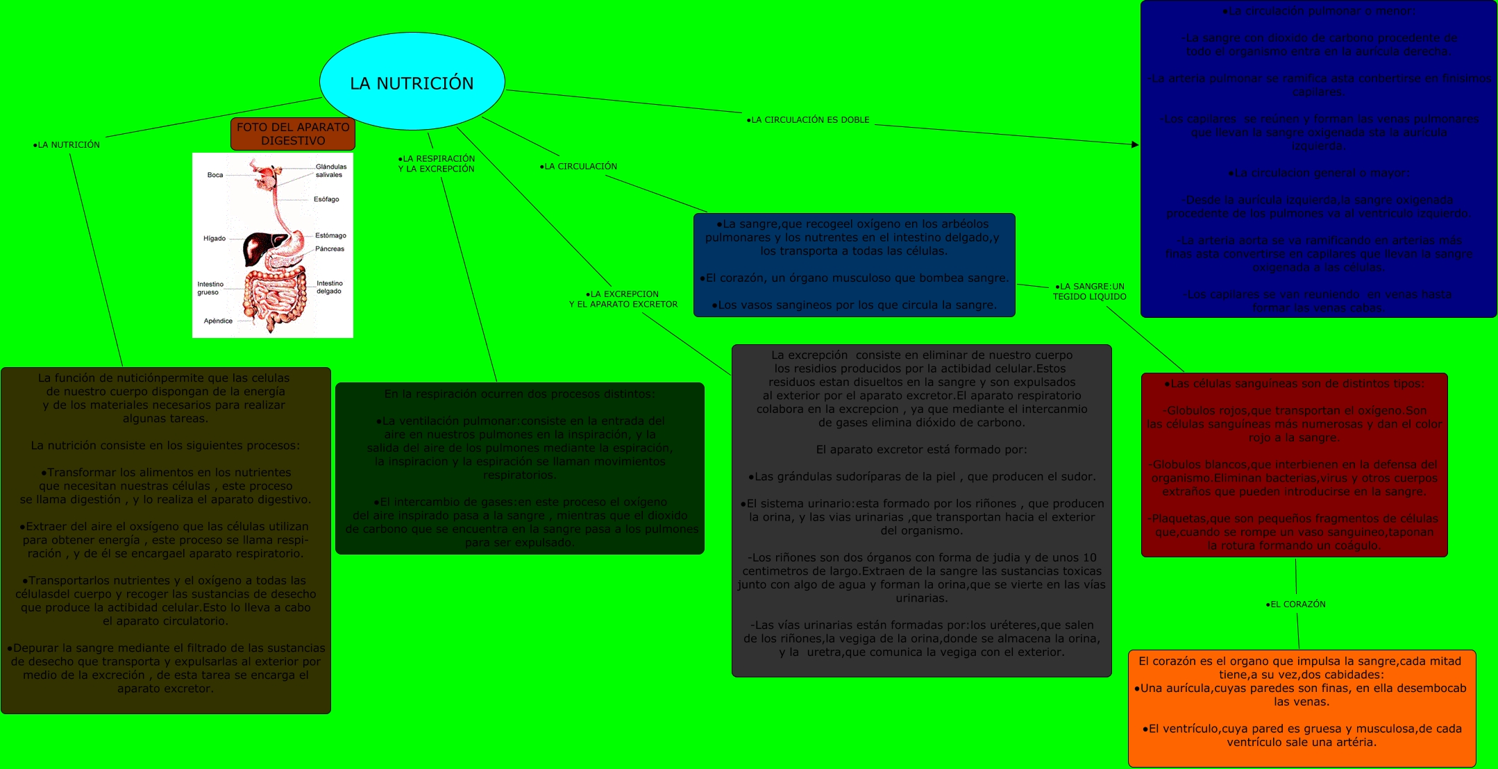 Este Cmap, tiene información relacionada con: CONO TEMA 5, LA NUTRICIÓN ∙LA RESPIRACIÓN Y LA EXCREPCIÓN En la respiración ocurren dos procesos distintos: ∙La ventilación pulmonar:consiste en la entrada del aire en nuestros pulmones en la inspiración, y la salida del aire de los pulmones mediante la espiración, la inspiracion y la espiración se llaman movimientos respiratorios. ∙El intercambio de gases:en este proceso el oxígeno del aire inspirado pasa a la sangre , mientras que el dioxido de carbono que se encuentra en la sangre pasa a los pulmones para ser expulsado., LA NUTRICIÓN 6 FOTO DEL APARATO DIGESTIVO, LA NUTRICIÓN ∙LA CIRCULACIÓN ∙La sangre,que recogeel oxígeno en los arbéolos pulmonares y los nutrentes en el intestino delgado,y los transporta a todas las células. ∙El corazón, un órgano musculoso que bombea sangre. ∙Los vasos sangineos por los que circula la sangre., LA NUTRICIÓN ∙LA EXCREPCION Y EL APARATO EXCRETOR La excrepción consiste en eliminar de nuestro cuerpo los residios producidos por la actibidad celular.Estos residuos estan disueltos en la sangre y son expulsados al exterior por el aparato excretor.El aparato respiratorio colabora en la excrepcion , ya que mediante el intercanmio de gases elimina dióxido de carbono. El aparato excretor está formado por: ∙Las grándulas sudoríparas de la piel , que producen el sudor. ∙El sistema urinario:esta formado por los riñones , que producen la orina, y las vias urinarias ,que transportan hacia el exterior del organismo. -Los riñones son dos órganos con forma de judia y de unos 10 centimetros de largo.Extraen de la sangre las sustancias toxicas junto con algo de agua y forman la orina,que se vierte en las vías urinarias. -Las vías urinarias están formadas por:los uréteres,que salen de los riñones,la vegiga de la orina,donde se almacena la orina, y la uretra,que comunica la vegiga con el exterior., LA NUTRICIÓN ∙LA NUTRICIÓN La función de nuticiónpermite que las celulas de nuestro cuerpo dispongan de la energía y de los materiales necesarios para realizar algunas tareas. La nutrición consiste en los siguientes procesos: ∙Transformar los alimentos en los nutrientes que necesitan nuestras células , este proceso se llama digestión , y lo realiza el aparato digestivo. ∙Extraer del aire el oxsígeno que las células utilizan para obtener energía , este proceso se llama respi- ración , y de él se encargael aparato respiratorio. ∙Transportarlos nutrientes y el oxígeno a todas las célulasdel cuerpo y recoger las sustancias de desecho que produce la actibidad celular.Esto lo lleva a cabo el aparato circulatorio. ∙Depurar la sangre mediante el filtrado de las sustancias de desecho que transporta y expulsarlas al exterior por medio de la excreción , de esta tarea se encarga el aparato excretor., ∙La sangre,que recogeel oxígeno en los arbéolos pulmonares y los nutrentes en el intestino delgado,y los transporta a todas las células. ∙El corazón, un órgano musculoso que bombea sangre. ∙Los vasos sangineos por los que circula la sangre. ∙LA SANGRE:UN TEGIDO LIQUIDO ∙Las células sanguíneas son de distintos tipos: -Globulos rojos,que transportan el oxígeno.Son las células sanguíneas más numerosas y dan el color rojo a la sangre. -Globulos blancos,que interbienen en la defensa del organismo.Eliminan bacterias,virus y otros cuerpos extraños que pueden introducirse en la sangre. -Plaquetas,que son pequeños fragmentos de células que,cuando se rompe un vaso sanguineo,taponan la rotura formando un coágulo., ∙Las células sanguíneas son de distintos tipos: -Globulos rojos,que transportan el oxígeno.Son las células sanguíneas más numerosas y dan el color rojo a la sangre. -Globulos blancos,que interbienen en la defensa del organismo.Eliminan bacterias,virus y otros cuerpos extraños que pueden introducirse en la sangre. -Plaquetas,que son pequeños fragmentos de células que,cuando se rompe un vaso sanguineo,taponan la rotura formando un coágulo. ∙EL CORAZÓN El corazón es el organo que impulsa la sangre,cada mitad tiene,a su vez,dos cabidades: ∙Una aurícula,cuyas paredes son finas, en ella desembocab las venas. ∙El ventrículo,cuya pared es gruesa y musculosa,de cada ventrículo sale una artéria., LA NUTRICIÓN ∙LA CIRCULACIÓN ES DOBLE ∙La circulación pulmonar o menor: -La sangre con dioxido de carbono procedente de todo el organismo entra en la aurícula derecha. -La arteria pulmonar se ramifica asta conbertirse en finisimos capilares. -Los capilares se reúnen y forman las venas pulmonares que llevan la sangre oxigenada sta la aurícula izquierda. ∙La circulacion general o mayor: -Desde la aurícula izquierda,la sangre oxigenada procedente de los pulmones va al ventriculo izquierdo. -La arteria aorta se va ramificando en arterias más finas asta convertirse en capilares que llevan la sangre oxigenada a las células. -Los capilares se van reuniendo en venas hasta formar las venas cabas.