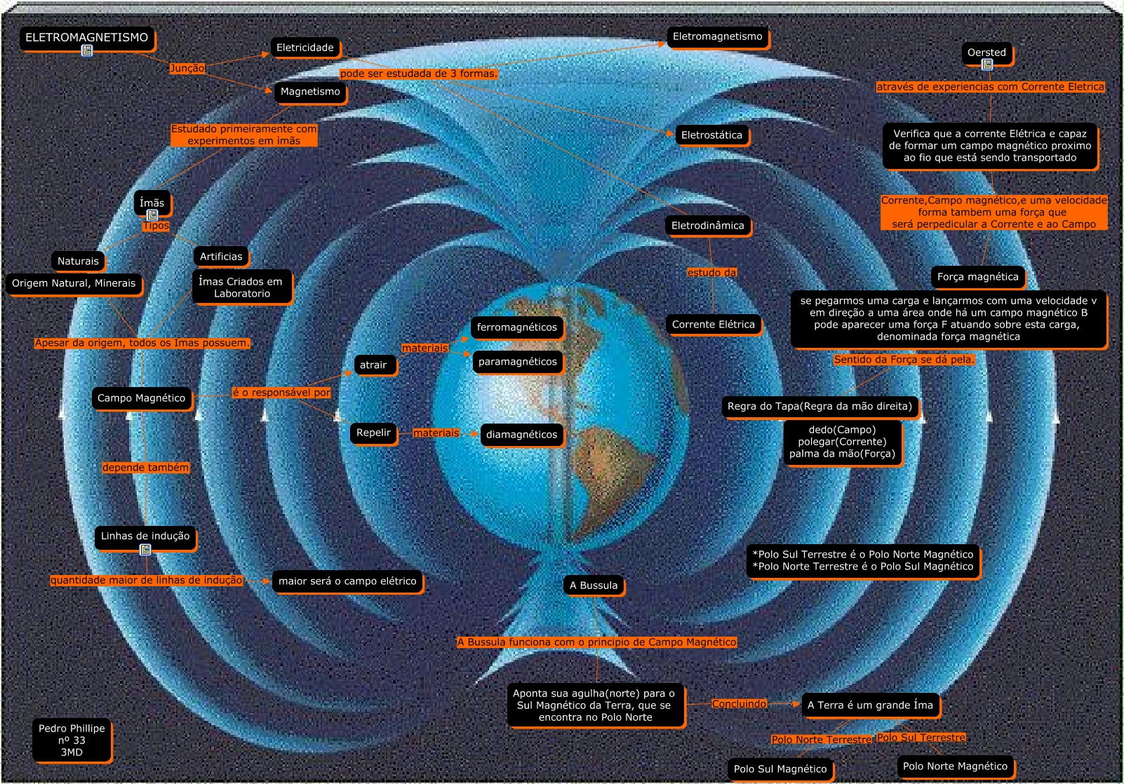 Esse mapa conceitual, produzido no IHMC CmapTools, tem a informação relacionada a: 33-Pedro Phillipe, Eletricidade pode ser estudada de 3 formas. Eletromagnetismo, Magnetismo Estudado primeiramente com experimentos em ìmãs Ímãs, atrair materiais ferromagnéticos, Linhas de indução quantidade maior de linhas de indução maior será o campo elétrico, Naturais Apesar da origem, todos os Imas possuem. Campo Magnético, Verifica que a corrente Elétrica e capaz de formar um campo magnético proximo ao fio que está sendo transportado Corrente,Campo magnético,e uma velocidade forma tambem uma força que será perpedicular a Corrente e ao Campo Força magnética, Eletricidade pode ser estudada de 3 formas. Eletrostática, ELETROMAGNETISMO Junção Eletricidade, Aponta sua agulha(norte) para o Sul Magnético da Terra, que se encontra no Polo Norte Concluindo A Terra é um grande Íma, Campo Magnético é o responsável por Repelir, A Terra é um grande Íma Polo Norte Terrestre Polo Sul Magnético, se pegarmos uma carga e lançarmos com uma velocidade v em direção a uma área onde há um campo magnético B pode aparecer uma força F atuando sobre esta carga, denominada força magnética Sentido da Força se dá pela. Regra do Tapa(Regra da mão direita), Oersted através de experiencias com Corrente Eletrica Verifica que a corrente Elétrica e capaz de formar um campo magnético proximo ao fio que está sendo transportado, Ímãs Tipos Artificias, Artificias Apesar da origem, todos os Imas possuem. Campo Magnético, A Terra é um grande Íma Polo Sul Terrestre Polo Norte Magnético, atrair materiais paramagnéticos, Campo Magnético depende também Linhas de indução, Campo Magnético é o responsável por atrair, Repelir materiais diamagnéticos