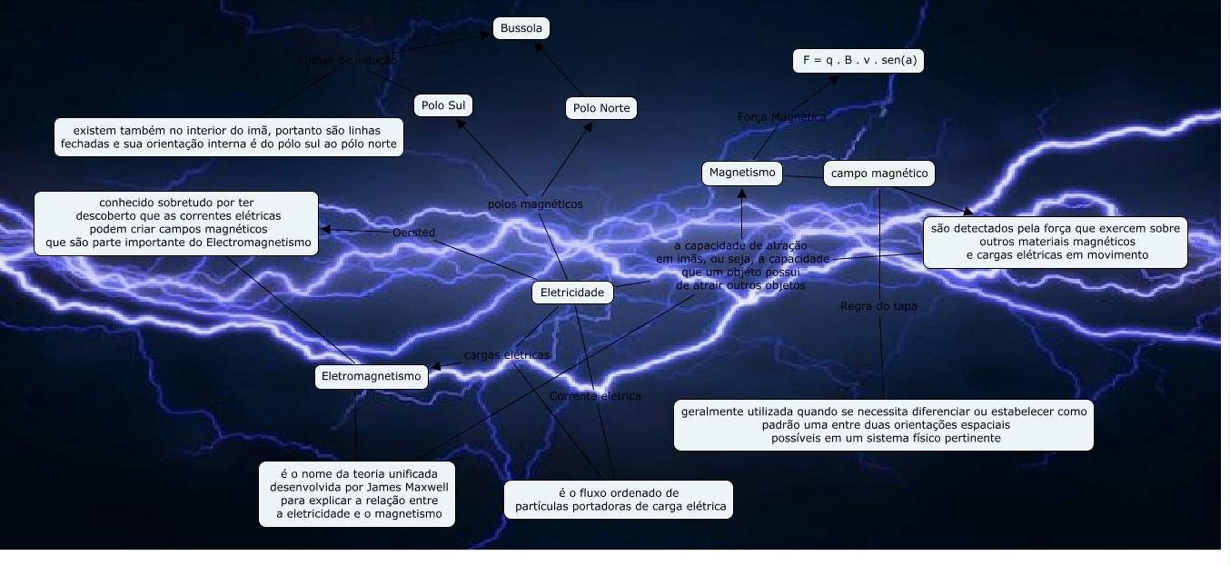 Esse mapa conceitual, produzido no IHMC CmapTools, tem a informação relacionada a: Elisa Dias, Polo Sul Linhas de indução existem também no interior do imã, portanto são linhas fechadas e sua orientação interna é do pólo sul ao pólo norte, Eletricidade Oersted conhecido sobretudo por ter descoberto que as correntes elétricas podem criar campos magnéticos que são parte importante do Electromagnetismo, Magnetismo campo magnético, Eletricidade polos magnéticos Polo Norte, Eletricidade Corrente eletrica é o fluxo ordenado de partículas portadoras de carga elétrica, é o fluxo ordenado de partículas portadoras de carga elétrica cargas elétricas Eletromagnetismo, Eletromagnetismo ???? é o nome da teoria unificada desenvolvida por James Maxwell para explicar a relação entre a eletricidade e o magnetismo, Eletricidade polos magnéticos Polo Sul, são detectados pela força que exercem sobre outros materiais magnéticos e cargas elétricas em movimento a capacidade de atração em imãs, ou seja, a capacidade que um objeto possui de atrair outros objetos Magnetismo, Eletricidade a capacidade de atração em imãs, ou seja, a capacidade que um objeto possui de atrair outros objetos é o nome da teoria unificada desenvolvida por James Maxwell para explicar a relação entre a eletricidade e o magnetismo, campo magnético Regra do tapa geralmente utilizada quando se necessita diferenciar ou estabelecer como padrão uma entre duas orientações espaciais possíveis em um sistema físico pertinente, Polo Sul Linhas de indução Bussola, conhecido sobretudo por ter descoberto que as correntes elétricas podem criar campos magnéticos que são parte importante do Electromagnetismo ???? Eletromagnetismo, são detectados pela força que exercem sobre outros materiais magnéticos e cargas elétricas em movimento a capacidade de atração em imãs, ou seja, a capacidade que um objeto possui de atrair outros objetos é o nome da teoria unificada desenvolvida por James Maxwell para explicar a relação entre a eletricidade e o magnetismo, Polo Norte ???? Bussola, Eletricidade cargas elétricas Eletromagnetismo, Magnetismo Força Magnetica F = q . B . v . sen(a), Eletricidade a capacidade de atração em imãs, ou seja, a capacidade que um objeto possui de atrair outros objetos Magnetismo, Magnetismo são detectados pela força que exercem sobre outros materiais magnéticos e cargas elétricas em movimento