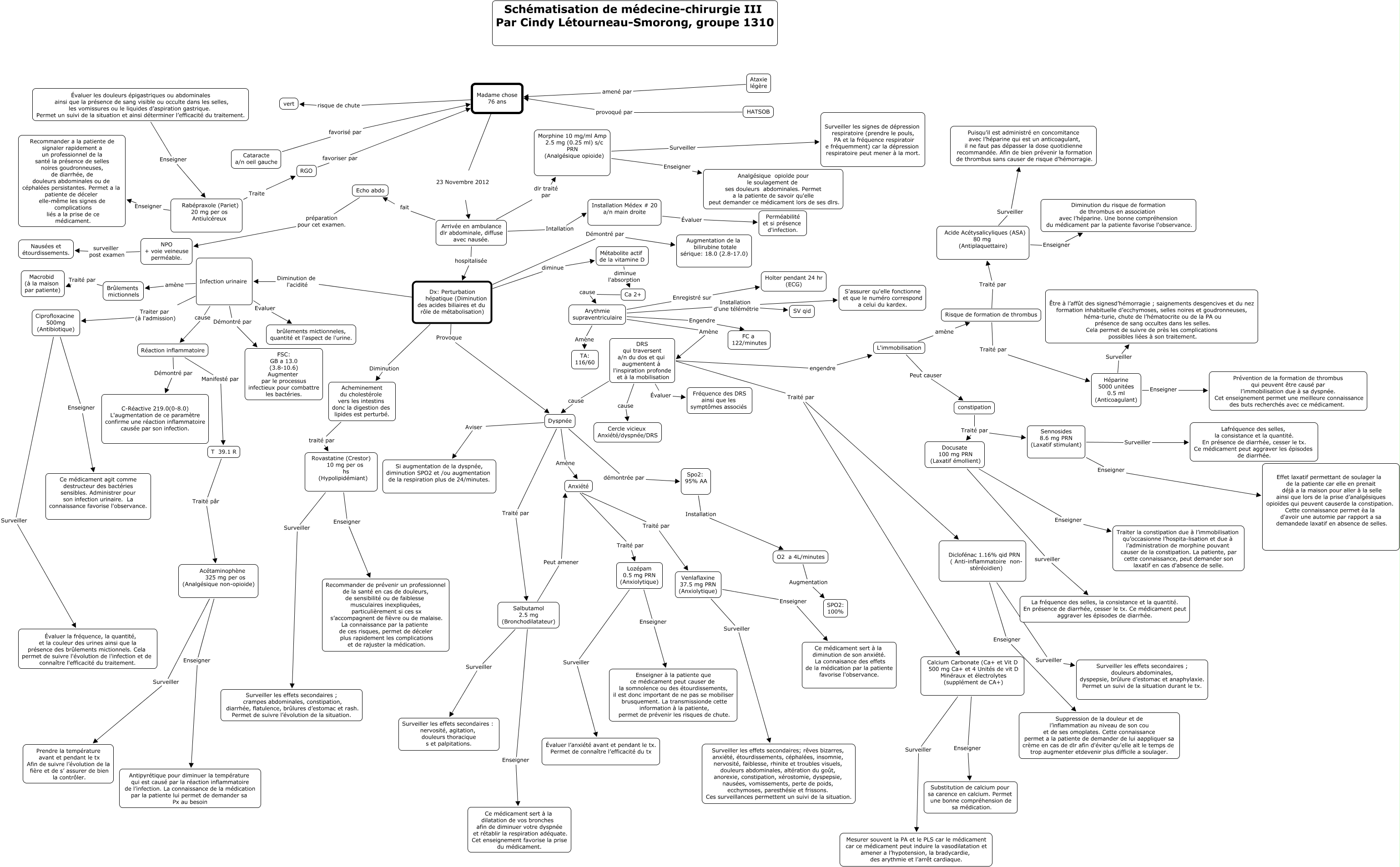 Cette carte de concepts créée avec IHMC CmapTools traite de: patiente ramieutée, L'immobilisation Peut causer constipation, Anxiété Traité par Venlaflaxine 37.5 mg PRN (Anxiolytique), Ca 2+ cause Arythmie supraventriculaire, NPO + voie veineuse perméable. surveiller post examen Nausées et étourdissements., Arrivée en ambulance dlr abdominale, diffuse avec nausée. Intallation Installation Médex # 20 a/n main droite, Venlaflaxine 37.5 mg PRN (Anxiolytique) Enseigner Ce médicament sert à la diminution de son anxiété. La connaisance des effets de la médication par la patiente favorise l'observance., Risque de formation de thrombus Traité par Héparine 5000 unitées 0.5 ml (Anticoagulant), Rabépraxole (Pariet) 20 mg per os Antiulcéreux Traite RGO, L'immobilisation amène Risque de formation de thrombus, Dx: Perturbation hépatique (Diminution des acides biliaires et du rôle de métabolisation) Diminution Acheminement du cholestérole vers les intestins donc la digestion des lipides est perturbé., Rovastatine (Crestor) 10 mg per os hs (Hypolipidémiant) Enseigner Recommander de prévenir un professionnel de la santé en cas de douleurs, de sensibilité ou de faiblesse musculaires inexpliquées, particulièrement si ces sx s’accompagnent de fièvre ou de malaise. La connaissance par la patiente de ces risques, permet de déceler plus rapidement les complications et de rajuster la médication., Anxiété Traité par Lozépam 0.5 mg PRN (Anxiolytique), Acide Acétysalicyliques (ASA) 80 mg (Antiplaquettaire) Enseigner Diminution du risque de formation de thrombus en association avec l’héparine. Une bonne compréhension du médicament par la patiente favorise l'observance., Diclofénac 1.16% qid PRN ( Anti-inflammatoire non- stéréoidien) Surveiller Surveiller les effets secondaires ; douleurs abdominales, dyspepsie, brûlure d’estomac et anaphylaxie. Permet un suivi de la situation durant le tx., Salbutamol 2.5 mg (Bronchodilatateur) Enseigner Ce médicament sert à la dilatation de vos bronches afin de diminuer votre dyspnée et rétablir la respiration adéquate. Cet enseignement favorise la prise du médicament., Cataracte a/n oeil gauche favorisé par Madame chose 76 ans, Ciprofloxacine 500mg (Antibiotique) Surveiller Évaluer la fréquence, la quantité, et la couleur des urines ainsi que la présence des brûlements mictionnels. Cela permet de suivre l'évolution de l'infection et de connaître l'efficacité du traitement., Dyspnée Traité par Salbutamol 2.5 mg (Bronchodilatateur), Acétaminophène 325 mg per os (Analgésique non-opioide) Surveiller Prendre la température avant et pendant le tx Afin de suivre l’évolution de la fière et de s’ assurer de bien la contrôler., DRS qui traversent a/n du dos et qui augmentent à l'inspiration profonde et à la mobilisation Traité par Diclofénac 1.16% qid PRN ( Anti-inflammatoire non- stéréoidien)