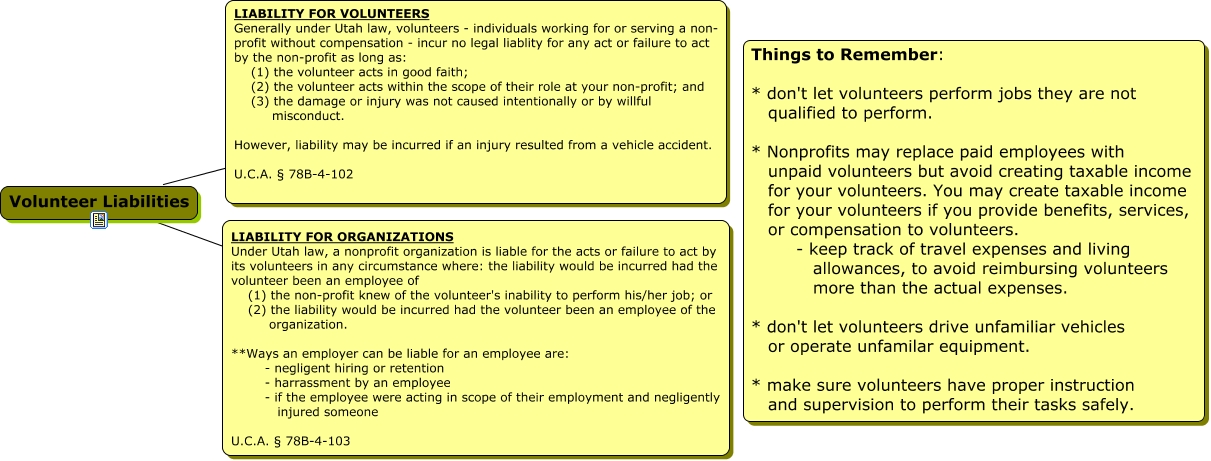 This Concept Map, created with IHMC CmapTools, has information related to: Volunteer Liability, Volunteer Liabilities ???? LIABILITY FOR ORGANIZATIONS Under Utah law, a nonprofit organization is liable for the acts or failure to act by its volunteers in any circumstance where: the liability would be incurred had the volunteer been an employee of (1) the non-profit knew of the volunteer's inability to perform his/her job; or (2) the liability would be incurred had the volunteer been an employee of the organization. **Ways an employer can be liable for an employee are: - negligent hiring or retention - harrassment by an employee - if the employee were acting in scope of their employment and negligently injured someone U.C.A. § 78B-4-103, Volunteer Liabilities ???? LIABILITY FOR VOLUNTEERS Generally under Utah law, volunteers - individuals working for or serving a non- profit without compensation - incur no legal liablity for any act or failure to act by the non-profit as long as: (1) the volunteer acts in good faith; (2) the volunteer acts within the scope of their role at your non-profit; and (3) the damage or injury was not caused intentionally or by willful misconduct. However, liability may be incurred if an injury resulted from a vehicle accident. U.C.A. § 78B-4-102