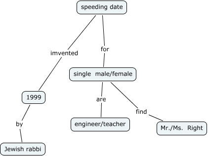 此概念图以 IHMC CmapTools 创建, 内含信息有关于: speeding date, single male/female find Mr./Ms. Right, speeding date for single male/female, 1999 by Jewish rabbi, speeding date imvented 1999, single male/female are engineer/teacher