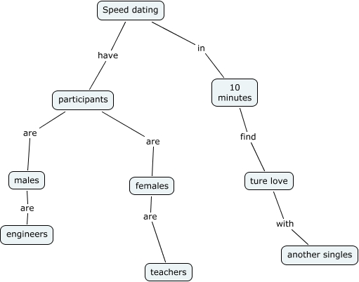 此概念图以 IHMC CmapTools 创建, 内含信息有关于: speed dating, ture love with another singles, 10 minutes find ture love, participants are males, Speed dating have participants, participants are females, Speed dating in 10 minutes, males are engineers, females are teachers
