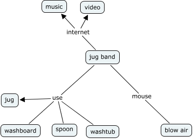 此概念图以 IHMC CmapTools 创建, 内含信息有关于: M10112249jug band, jug band use washboard, jug band internet music, jug band use spoon, jug band internet video, jug band use jug, jug band use washtub, jug band mouse blow air
