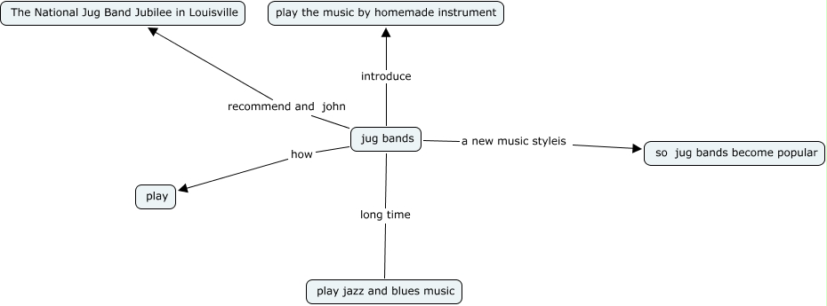 此概念图以 IHMC CmapTools 创建, 内含信息有关于: jug time, jug bands introduce play the music by homemade instrument, jug bands a new music styleis so jug bands become popular, jug bands how play, jug bands recommend and john The National Jug Band Jubilee in Louisville, jug bands long time play jazz and blues music
