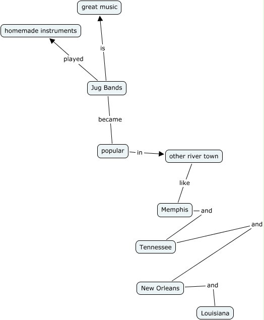 此概念图以 IHMC CmapTools 创建, 内含信息有关于: M10125025 Lily Speed date, other river town like Memphis, Jug Bands played homemade instruments, Memphis and Tennessee, Jug Bands is great music, Tennessee and New Orleans, Jug Bands became popular, New Orleans and Louisiana, popular in other river town