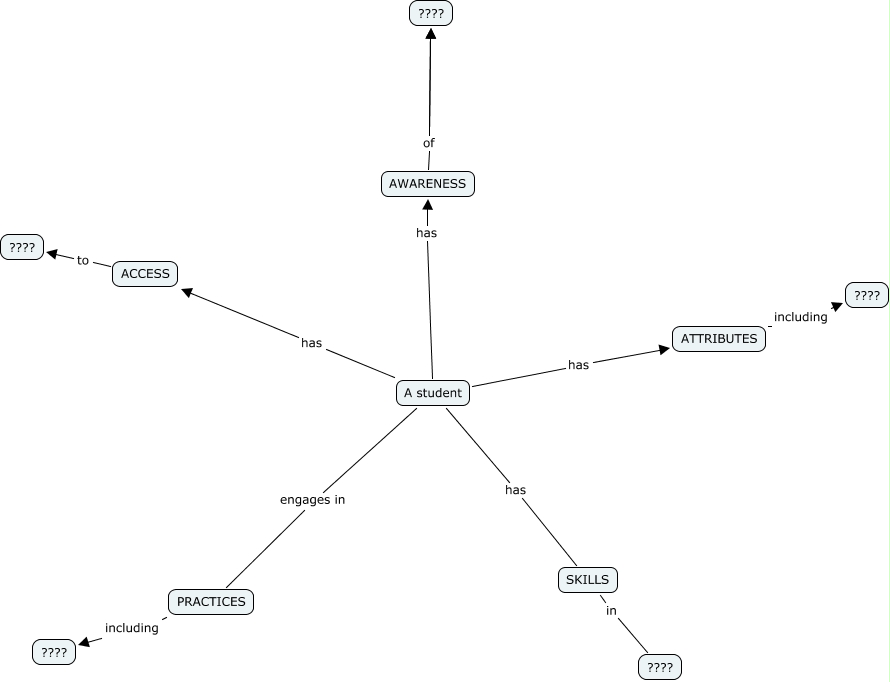 This Concept Map, created with IHMC CmapTools, has information related to: Student-responses, PRACTICES including ????, A student has SKILLS, A student engages in PRACTICES, SKILLS in ????, A student has ATTRIBUTES, ACCESS to ????, AWARENESS of ????, A student has ACCESS, AWARENESS of ????, A student has AWARENESS, ATTRIBUTES including ????