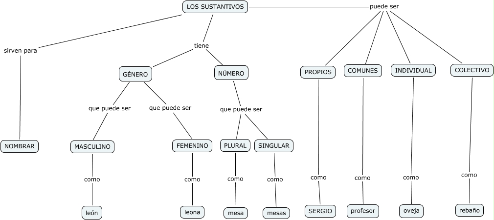 Este Cmap, tiene información relacionada con: LOS SUSTANTIVOS (Álvaro), FEMENINO como leona, GÉNERO que puede ser MASCULINO, LOS SUSTANTIVOS puede ser INDIVIDUAL, LOS SUSTANTIVOS tiene NÚMERO, LOS SUSTANTIVOS tiene GÉNERO, GÉNERO que puede ser FEMENINO, LOS SUSTANTIVOS puede ser PROPIOS, LOS SUSTANTIVOS puede ser COLECTIVO, NÚMERO que puede ser SINGULAR, LOS SUSTANTIVOS puede ser COMUNES, INDIVIDUAL como oveja, PLURAL como mesa, NÚMERO que puede ser PLURAL, COMUNES como profesor, PROPIOS como SERGIO, COLECTIVO como rebaño, SINGULAR como mesas, MASCULINO como león, LOS SUSTANTIVOS sirven para NOMBRAR