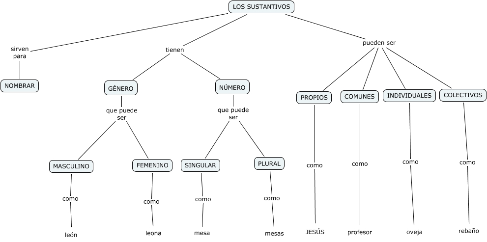 Este Cmap, tiene información relacionada con: LOS SUSTANTIVOS(Jesús), PROPIOS como JESÚS, LOS SUSTANTIVOS pueden ser INDIVIDUALES, INDIVIDUALES como oveja, FEMENINO como leona, LOS SUSTANTIVOS pueden ser COLECTIVOS, SINGULAR como mesa, MASCULINO como león, GÉNERO que puede ser MASCULINO, COMUNES como profesor, LOS SUSTANTIVOS tienen GÉNERO, LOS SUSTANTIVOS pueden ser PROPIOS, NÚMERO que puede ser SINGULAR, NÚMERO que puede ser PLURAL, GÉNERO que puede ser FEMENINO, LOS SUSTANTIVOS sirven para NOMBRAR, PLURAL como mesas, LOS SUSTANTIVOS pueden ser COMUNES, LOS SUSTANTIVOS tienen NÚMERO, COLECTIVOS como rebaño