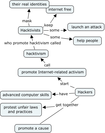 此概念图以 IHMC CmapTools 创建, 内含信息有关于: B10132020 Hacktivism, Hackers start promote Internet-related activism, Hackers get together promote a cause, Hacktivists mask their real identities, Hackers have advanced computer skills, Hacktivists some launch an attack, Hacktivists keep internet free, hacktivism who promote hacktivism called Hacktivists, Hackers get together protest unfair laws and practices, promote Internet-related activism call hacktivism, Hacktivists some help people