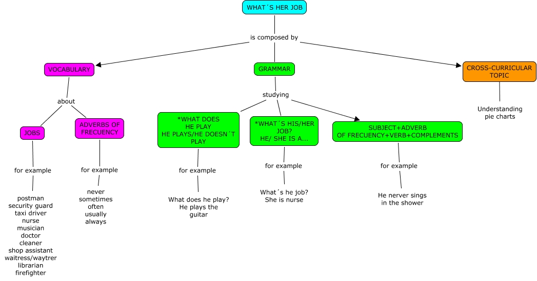 Este Cmap, tiene información relacionada con: WHAT´S HER JOB_ Ana, CROSS-CURRICULAR TOPIC ???? Understanding pie charts, GRAMMAR studying *WHAT´S HIS/HER JOB? HE/ SHE IS A..., WHAT´S HER JOB is composed by CROSS-CURRICULAR TOPIC, SUBJECT+ADVERB OF FRECUENCY+VERB+COMPLEMENTS for example He nerver sings in the shower, VOCABULARY about ADVERBS OF FRECUENCY, *WHAT DOES HE PLAY HE PLAYS/HE DOESN´T PLAY for example What does he play? He plays the guitar, JOBS for example postman security guard taxi driver nurse musician doctor cleaner shop assistant waitress/waytrer librarian firefighter, WHAT´S HER JOB is composed by GRAMMAR, GRAMMAR studying SUBJECT+ADVERB OF FRECUENCY+VERB+COMPLEMENTS, VOCABULARY about JOBS, ADVERBS OF FRECUENCY for example never sometimes often usually always, *WHAT´S HIS/HER JOB? HE/ SHE IS A... for example What´s he job? She is nurse, GRAMMAR studying *WHAT DOES HE PLAY HE PLAYS/HE DOESN´T PLAY, WHAT´S HER JOB is composed by VOCABULARY