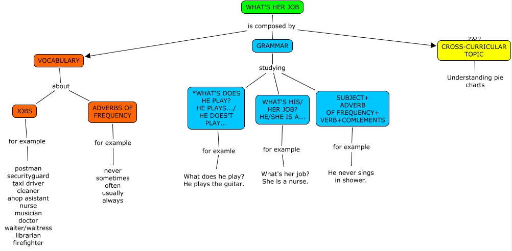 Este Cmap, tiene información relacionada con: WHAT´S HER JOB_ Rubénl, VOCABULARY about JOBS, GRAMMAR studying *WHAT'S DOES HE PLAY? HE PLAYS.../ HE DOES'T PLAY..., CROSS-CURRICULAR TOPIC ???? Understanding pie charts, SUBJECT+ ADVERB OF FREQUENCY+ VERB+COMLEMENTS for example He never sings in shower., VOCABULARY about ADVERBS OF FREQUENCY, *WHAT'S DOES HE PLAY? HE PLAYS.../ HE DOES'T PLAY... for examle What does he play? He plays the guitar., WHAT'S HER JOB is composed by VOCABULARY, WHAT'S HIS/ HER JOB? HE/SHE IS A... for example What's her job? She is a nurse., WHAT'S HER JOB is composed by GRAMMAR, JOBS for example postman securityguard taxi driver cleaner ahop asistant nurse musician doctor waiter/waitress librarian firefighter, GRAMMAR studying SUBJECT+ ADVERB OF FREQUENCY+ VERB+COMLEMENTS, WHAT'S HER JOB is composed by CROSS-CURRICULAR TOPIC, GRAMMAR studying WHAT'S HIS/ HER JOB? HE/SHE IS A..., ADVERBS OF FREQUENCY for example never sometimes often usually always