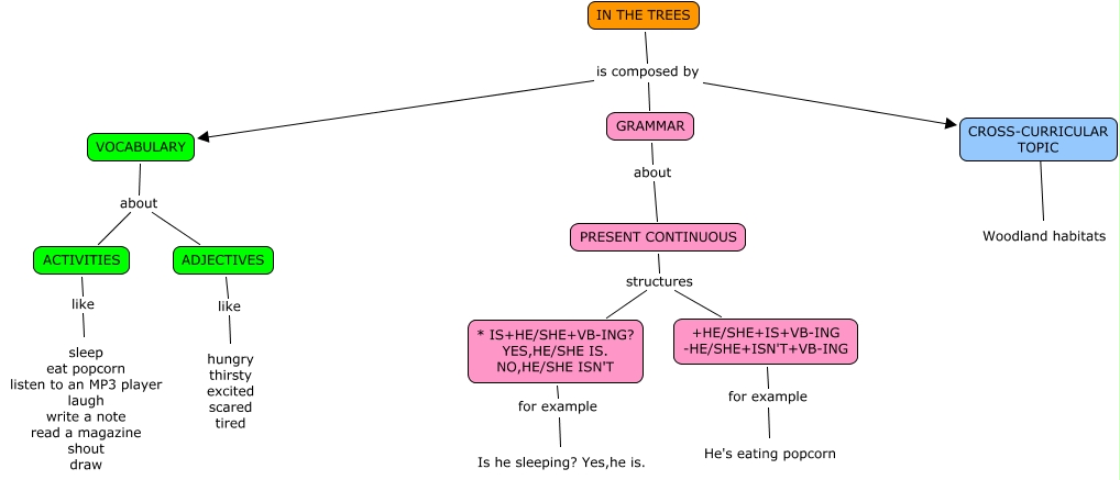 Este Cmap, tiene información relacionada con: IN THE TREES (SILVIA), * IS+HE/SHE+VB-ING? YES,HE/SHE IS. NO,HE/SHE ISN'T for example Is he sleeping? Yes,he is., ADJECTIVES like hungry thirsty excited scared tired, VOCABULARY about ACTIVITIES, ACTIVITIES like sleep eat popcorn listen to an MP3 player laugh write a note read a magazine shout draw, +HE/SHE+IS+VB-ING -HE/SHE+ISN'T+VB-ING for example He's eating popcorn, IN THE TREES is composed by VOCABULARY, GRAMMAR about PRESENT CONTINUOUS, PRESENT CONTINUOUS structures * IS+HE/SHE+VB-ING? YES,HE/SHE IS. NO,HE/SHE ISN'T, PRESENT CONTINUOUS structures +HE/SHE+IS+VB-ING -HE/SHE+ISN'T+VB-ING, IN THE TREES is composed by GRAMMAR, VOCABULARY about ADJECTIVES, CROSS-CURRICULAR TOPIC ???? Woodland habitats, IN THE TREES is composed by CROSS-CURRICULAR TOPIC