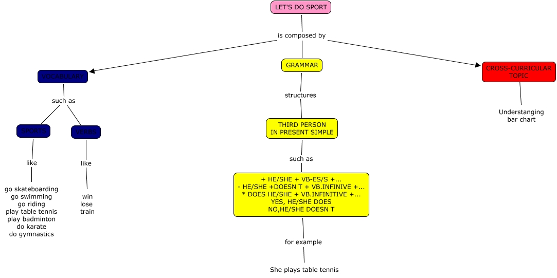Este Cmap, tiene información relacionada con: LET´T DO SPORT_Lucía Ro, THIRD PERSON IN PRESENT SIMPLE such as + HE/SHE + VB-ES/S +... - HE/SHE +DOESN T + VB.INFINIVE +... * DOES HE/SHE + VB.INFINITIVE +... YES, HE/SHE DOES NO,HE/SHE DOESN T, VOCABULARY such as VERBS, SPORTS like go skateboarding go swimming go riding play table tennis play badminton do karate do gymnastics, GRAMMAR structures THIRD PERSON IN PRESENT SIMPLE, LET'S DO SPORT is composed by GRAMMAR, LET'S DO SPORT is composed by CROSS-CURRICULAR TOPIC, LET'S DO SPORT is composed by VOCABULARY, + HE/SHE + VB-ES/S +... - HE/SHE +DOESN T + VB.INFINIVE +... * DOES HE/SHE + VB.INFINITIVE +... YES, HE/SHE DOES NO,HE/SHE DOESN T for example She plays table tennis, VOCABULARY such as SPORTS, CROSS-CURRICULAR TOPIC ???? Understanging bar chart, VERBS like win lose train