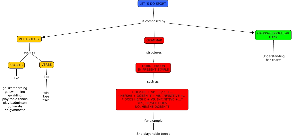 Este Cmap, tiene información relacionada con: LET´T DO SPORT_Sergio, THIRD PERSON IN PRESENT SIMPLE such as + HE/SHE + VB -ES/-S +... - HE/SHE + DOESN´T + VB. INFINITIVE +... * DOES HE/SHE + VB. INFINITIVE +...? YES, HE/SHE DOES NO, HE/SHE DOESN´T, VOCABULARY such as SPORTS, CROSS-CURRICULAR TOPIC ???? Understanding bar charts, + HE/SHE + VB -ES/-S +... - HE/SHE + DOESN´T + VB. INFINITIVE +... * DOES HE/SHE + VB. INFINITIVE +...? YES, HE/SHE DOES NO, HE/SHE DOESN´T for example She plays table tennis, GRAMMAR structures THIRD PERSON IN PRESENT SIMPLE, SPORTS like go skatebording go swimming go riding play table tennis play badminton do karate do gymnastic, LET´S DO SPORT is composed by VOCABULARY, VERBS like win lose train, VOCABULARY such as VERBS, LET´S DO SPORT is composed by GRAMMAR, LET´S DO SPORT is composed by CROSS-CURRICULAR TOPIC