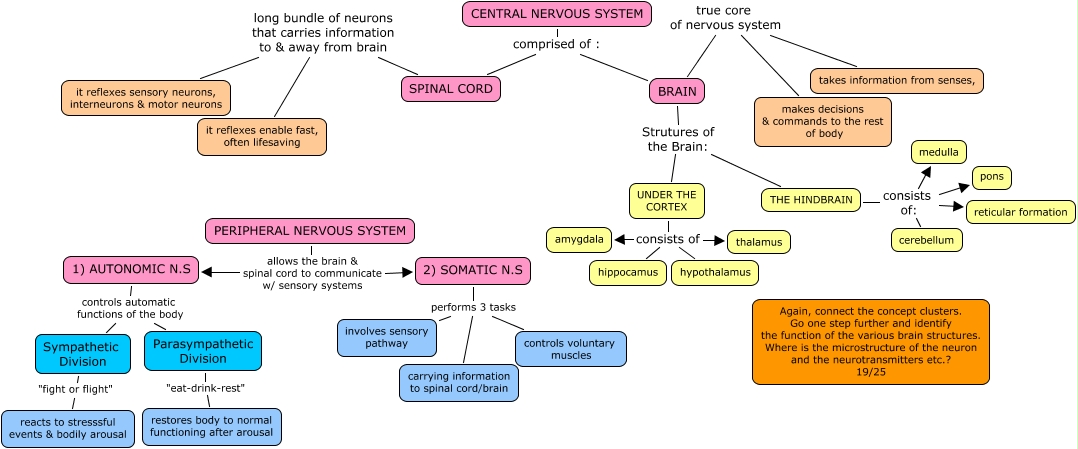 This Concept Map, created with IHMC CmapTools, has information related to: C2 AngelicaGaytano 19, UNDER THE CORTEX consists of hypothalamus, SPINAL CORD long bundle of neurons that carries information to & away from brain it reflexes enable fast, often lifesaving, UNDER THE CORTEX consists of amygdala, PERIPHERAL NERVOUS SYSTEM allows the brain & spinal cord to communicate w/ sensory systems 1) AUTONOMIC N.S, 2) SOMATIC N.S performs 3 tasks carrying information to spinal cord/brain, 1) AUTONOMIC N.S controls automatic functions of the body Parasympathetic Division, THE HINDBRAIN consists of: cerebellum, Sympathetic Division "fight or flight" reacts to stresssful events & bodily arousal, BRAIN true core of nervous system makes decisions & commands to the rest of body, SPINAL CORD long bundle of neurons that carries information to & away from brain it reflexes sensory neurons, interneurons & motor neurons, Parasympathetic Division "eat-drink-rest" restores body to normal functioning after arousal, UNDER THE CORTEX consists of thalamus, 2) SOMATIC N.S performs 3 tasks involves sensory pathway, BRAIN Strutures of the Brain: UNDER THE CORTEX, UNDER THE CORTEX consists of hippocamus, PERIPHERAL NERVOUS SYSTEM allows the brain & spinal cord to communicate w/ sensory systems 2) SOMATIC N.S, BRAIN Strutures of the Brain: THE HINDBRAIN, THE HINDBRAIN consists of: reticular formation, THE HINDBRAIN consists of: pons, 1) AUTONOMIC N.S controls automatic functions of the body Sympathetic Division