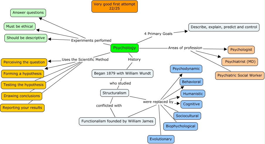 This Concept Map, created with IHMC CmapTools, has information related to: CH1JasonBoyett 22, Functionalism founded by William James were replaced by Psychodynamic, Functionalism founded by William James were replaced by Humanistic, Psychology Areas of profession Psychologist, Functionalism founded by William James were replaced by Behavioral, Structuralism were replaced by Evolutionary, Psychology 4 Primary Goals Describe, explain, predict and control, Psychology Uses the Scientific Method Perceiving the question, Structuralism were replaced by Humanistic, Psychology Uses the Scientific Method Drawing conclusions, Psychology Uses the Scientific Method Testing the hypothesis, Psychology Areas of profession Psychiatrist (MD), Structuralism were replaced by Biophychological, Psychology Uses the Scientific Method Forming a hypothesis, Began 1879 with William Wundt who studied Structuralism, Structuralism were replaced by Psychodynamic, Psychology Areas of profession Psychiatric Social Worker, Psychology Experiments perfomed Must be ethical, Psychology Experiments perfomed Should be descriptive, Functionalism founded by William James were replaced by Sociocultural, Psychology Experiments perfomed Answer questions