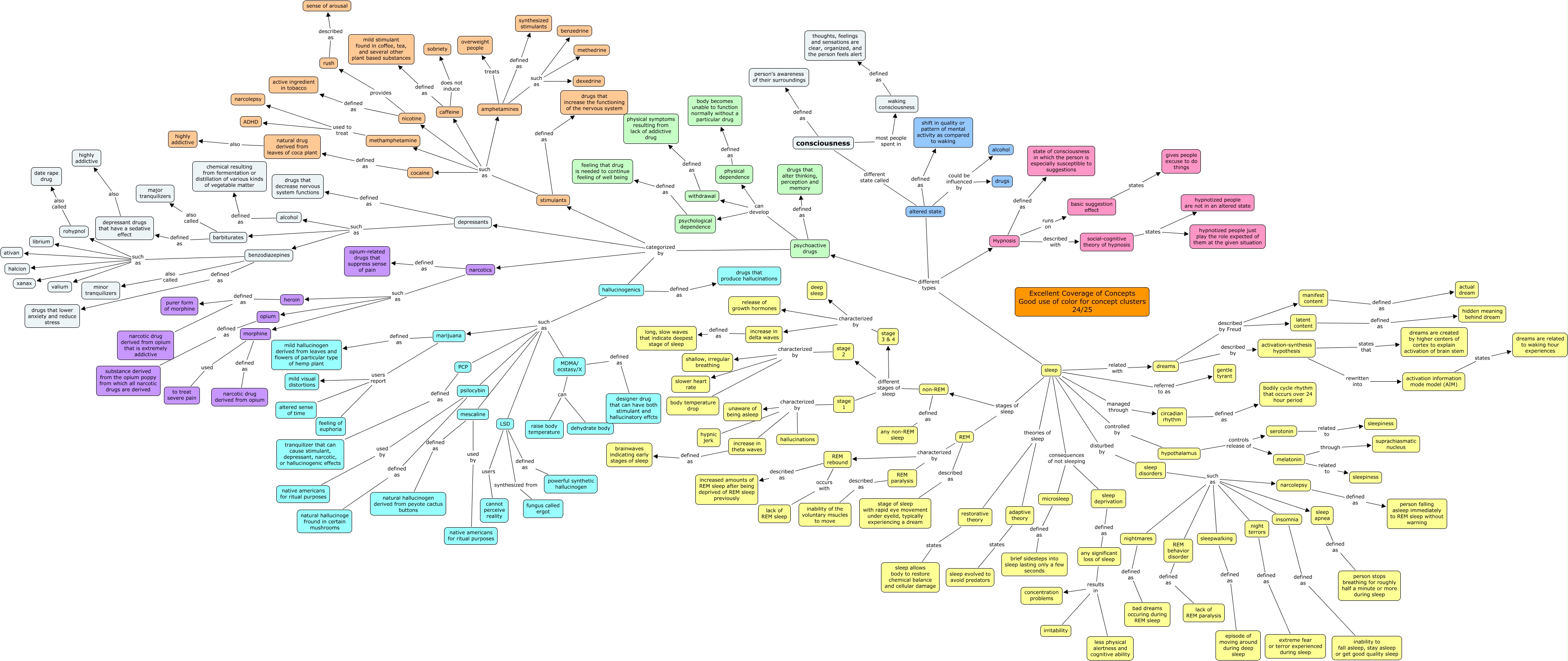 This Concept Map, created with IHMC CmapTools, has information related to: Ch 4 Young Baek 24, sleep referred to as gentle tyrant, narcotics such as morphine, stage 2 characterized by body temperature drop, non-REM defined as any non-REM sleep, stage 1 characterized by hypnic jerk, benzodiazepines such as librium, amphetamines treats overweight people, sleep controlled by hypothalamus, hypothalamus controls release of melatonin, psychoactive drugs can develop physical dependence, activation-synthesis hypothesis rewritten into activation information mode model (AIM), hallucinogenics such as psilocybin, heroin defined as purer form of morphine, nicotine defined as active ingredient in tobacco, physical dependence defined as body becomes unable to function normally without a particular drug, social-cognitive theory of hypnosis states hypnotized people are not in an altered state, nightmares defined as bad dreams occuring during REM sleep, natural drug derived from leaves of coca plant also highly addictive, psychoactive drugs categorized by narcotics, barbiturates also called major tranquilizers
