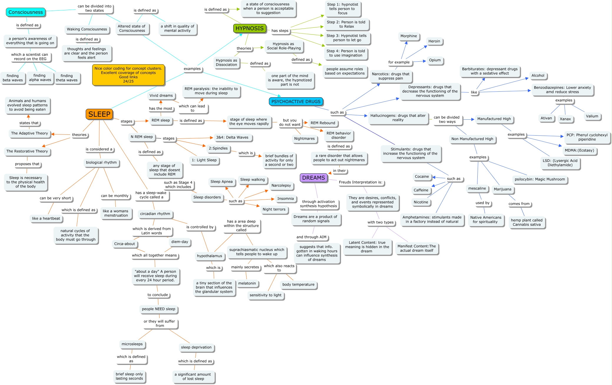 This Concept Map, created with IHMC CmapTools, has information related to: Anesia Potter Ch4 24, Dreams are a product of random signals and through AIM suggests that info. gotten in waking hours can influence synthesis of dreams, Stimulants: drugs that increase the functioning of the nervous system such as Amphetamines: stimulants made in a factory instead of natural, SLEEP has a sleep-wake cycle called a circadian rhythm, Marijuana comes from hemp plant called Cannabis sativa, circadian rhythm which is derived from Latin words Circa-about, N REM sleep stages 3&4: Delta Waves, stage of sleep where the eye moves rapidly but you do not want REM behavior disorder, suprachiasmatic nucleus which tells people to wake up which also reacts to sensitivity to light, biological rhythm can be very short like a heartbeat, N REM sleep is defined as any stage of sleep that doesnt include REM, HYPNOSIS has steps Step 4: Person is told to use imagination, Hypnosis as Social Role-Playing defined as people assume roles based on expectations, N REM sleep stages 1: Light Sleep, PSYCHOACTIVE DRUGS such as Stimulants: drugs that increase the functioning of the nervous system, stage of sleep where the eye moves rapidly but you do not want REM Rebound, biological rhythm can be monthly like a womans menstruation, Sleep disorders such as Narcolepsy, suprachiasmatic nucleus which tells people to wake up which also reacts to body temperature, Circa-about which all together means "about a day" A person will receive sleep during every 24 hour period., Hallucinogens: drugs that alter reality can be divided two ways Non Manufactured High