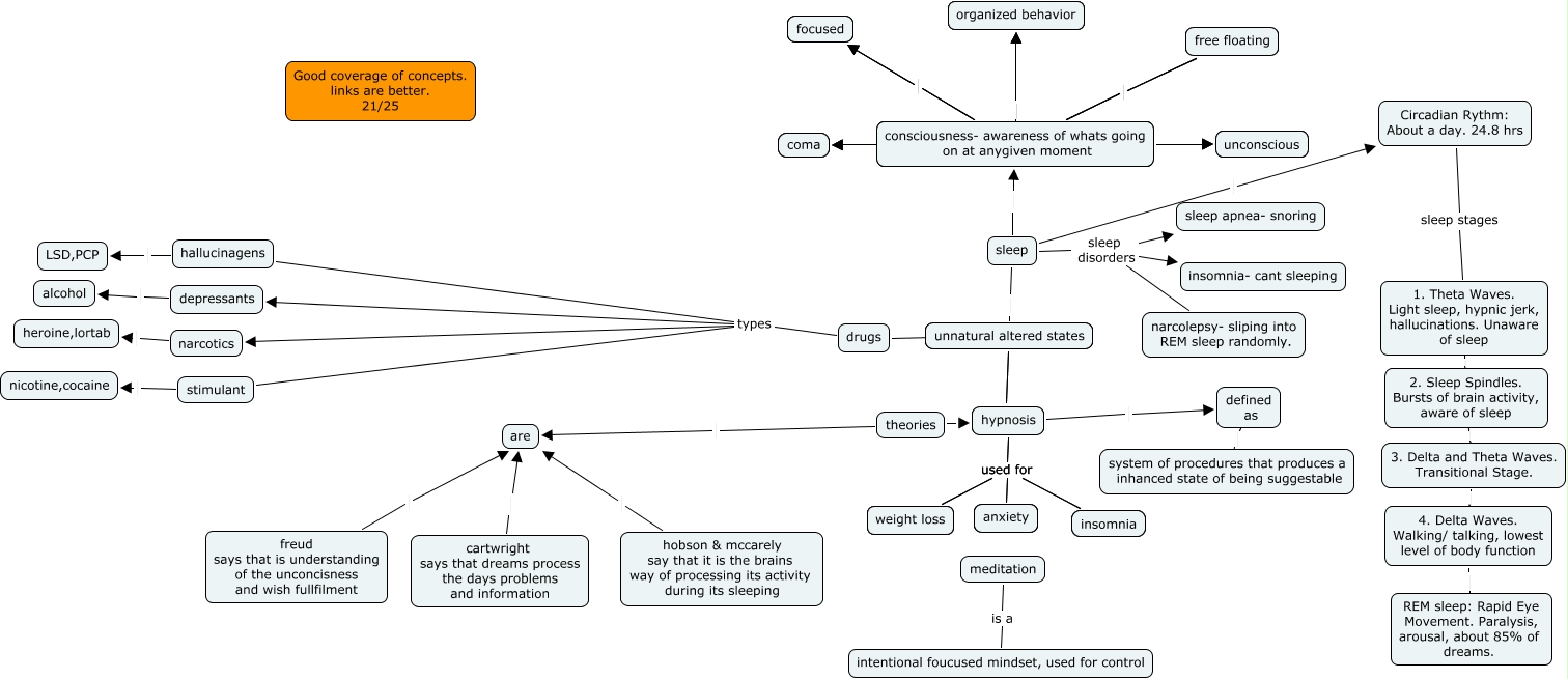 This Concept Map, created with IHMC CmapTools, has information related to: ben siegel ch 4 21, defined as system of procedures that produces a inhanced state of being suggestable, 3. Delta and Theta Waves. Transitional Stage. 4. Delta Waves. Walking/ talking, lowest level of body function, hypnosis used for anxiety, sleep sleep disorders sleep apnea- snoring, 4. Delta Waves. Walking/ talking, lowest level of body function REM sleep: Rapid Eye Movement. Paralysis, arousal, about 85% of dreams., consciousness- awareness of whats going on at anygiven moment ???? unconscious, drugs types depressants, Circadian Rythm: About a day. 24.8 hrs sleep stages 1. Theta Waves. Light sleep, hypnic jerk, hallucinations. Unaware of sleep, hallucinagens types depressants, sleep unnatural altered states, consciousness- awareness of whats going on at anygiven moment ???? coma, free floating consciousness- awareness of whats going on at anygiven moment, sleep sleep disorders narcolepsy- sliping into REM sleep randomly., hobson & mccarely say that it is the brains way of processing its activity during its sleeping are, stimulant nicotine,cocaine, hypnosis used for insomnia, consciousness- awareness of whats going on at anygiven moment focused, meditation is a intentional foucused mindset, used for control, sleep consciousness- awareness of whats going on at anygiven moment, unnatural altered states hypnosis