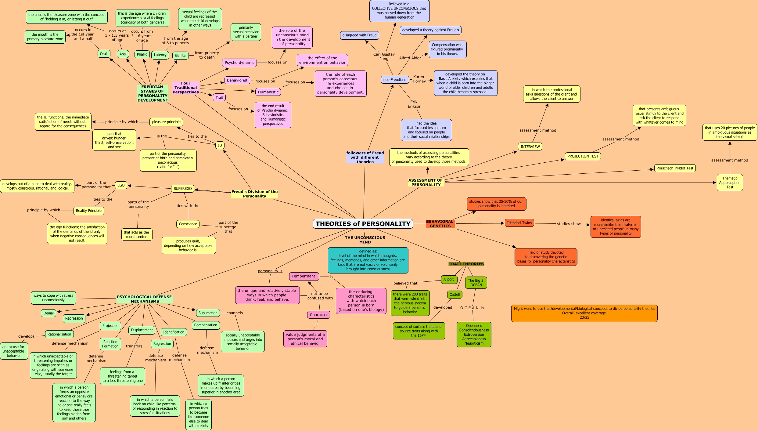 This Concept Map, created with IHMC CmapTools, has information related to: BUCK Chp 13 23, THEORIES of PERSONALITY Four Traditional Perspectives Behaviorist, ways to cope with stress unconsciously PSYCHOLOGICAL DEFENSE MECHANISMS Compensation, THEORIES of PERSONALITY PSYCHOLOGICAL DEFENSE MECHANISMS Denial, INTERVIEW assessment method in which the professional asks questions of the client and allows the client to answer, THEORIES of PERSONALITY personality is the unique and relatively stable ways in which people think, feel, and behave., Humanistic focuses on the role of each person's conscious life experiences and choices in personality development., THEORIES of PERSONALITY THE UNCONSCIOUS MIND defined as: level of the mind in which thoughts, feelings, memories, and other information are kept that are not easily or voluntarily brought into consciousness, THEORIES of PERSONALITY FREUDIAN STAGES OF PERSONALITY DEVELOPMENT Anal, THEORIES of PERSONALITY PSYCHOLOGICAL DEFENSE MECHANISMS Rationalization, Identical Twins studies show identical twins are more similar than fraternal or unrelated people in many types of personality, THEORIES of PERSONALITY ASSESSMENT OF PERSONALITY INTERVIEW, THEORIES of PERSONALITY FREUDIAN STAGES OF PERSONALITY DEVELOPMENT Latency, ways to cope with stress unconsciously PSYCHOLOGICAL DEFENSE MECHANISMS Projection, ways to cope with stress unconsciously PSYCHOLOGICAL DEFENSE MECHANISMS Reaction Formation, THEORIES of PERSONALITY TRAIT THEORIES Allport, Sublimation channels socially unacceptable impulses and urges into socially acceptable behavior, neo-Freudians Karen Horney developed the theory on Basic Anxiety which explains that when a child is born into the bigger world of older children and adults the child becomes stressed., Thematic Apperception Test assessment method that uses 20 pictures of people in ambiguous situations as the visual stimuli, THEORIES of PERSONALITY FREUDIAN STAGES OF PERSONALITY DEVELOPMENT Phallic, Compensation defense mechanism in which a person makes up fr inferiorities in one area by becoming superior in another area