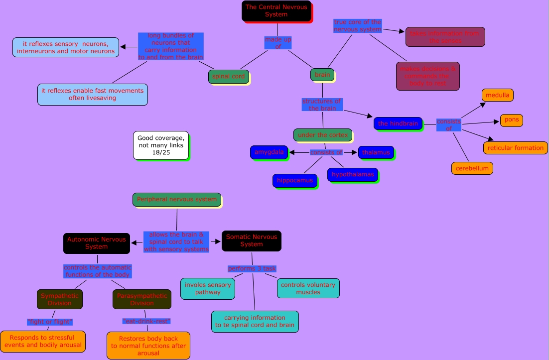 This Concept Map, created with IHMC CmapTools, has information related to: Chapter 11 brandon tinkle 18, Autonomic Nervous System controls the automatic functions of the body Parasympathetic Division, spinal cord long bundles of neurons that carry information to and from the brain it reflexes sensory neurons, interneurons and motor neurons, Parasympathetic Division "eat-drink-rest" Restores body back to normal functions after arousal, brain true core of the nervous system takes information from the senses, under the cortex consists of hypothalamas, under the cortex consists of hippocamus, Sympathetic Division "fight or flight" Responds to stressful events and bodily arousal, the hindbrain consists of pons, Somatic Nervous System performs 3 task carrying information to te spinal cord and brain, The Central Nevrous System made up of brain, under the cortex consists of thalamus, The Central Nevrous System made up of spinal cord, the hindbrain consists of medulla, brain true core of the nervous system makes decisions & commands the body to rest, Autonomic Nervous System controls the automatic functions of the body Sympathetic Division, Peripheral nervous system allows the brain & spinal cord to talk with sensory systems Somatic Nervous System, the hindbrain consists of cerebellum, the hindbrain consists of reticular formation, Somatic Nervous System performs 3 task controls voluntary muscles, brain structures of the brain the hindbrain