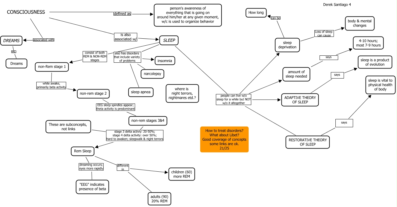 This Concept Map, created with IHMC CmapTools, has information related to: Derek Santiago Ch4 21, RESTORATIVE THEORY OF SLEEP says sleep is vital to physical health of body, non-rem stages 3&4 stage 3 delta activiy: 20-50%; stage 4 delta activity: over 50%; hard to awaken; sleepwalk & night terrors Rem Sleep, sleep deprivation Loss of sleep can cause body & mental changes, DREAMS vs. Dreams, SLEEP also has disorders that include variety of problems sleep apnea, CONSCIOUSNESS is also associated w/ SLEEP, non-rem stage 2 EEG sleep spindles appear; theta activity is predominant non-rem stages 3&4, SLEEP people can live w/o sleep for a while but NOT w/o it altogether sleep deprivation, SLEEP people can live w/o sleep for a while but NOT w/o it altogether ADAPTIVE THEORY OF SLEEP, sleep deprivation can be How long, SLEEP people can live w/o sleep for a while but NOT w/o it altogether amount of sleep needed, Rem Sleep different in children (60) more REM, SLEEP also has disorders that include variety of problems insomnia, SLEEP consist of both REM & NON-REM stages non-Rem stage 1, SLEEP also has disorders that include variety of problems narcolepsy, CONSCIOUSNESS defined as person's awareness of everything that is going on around him/her at any given moment, w/c is used to organize behavior, Rem Sleep dreaming occurs; eyes more rapidly "EEG" indicates presence of beta, CONSCIOUSNESS associated with DREAMS, Rem Sleep different in adults (90) 20% REM, SLEEP people can live w/o sleep for a while but NOT w/o it altogether RESTORATIVE THEORY OF SLEEP