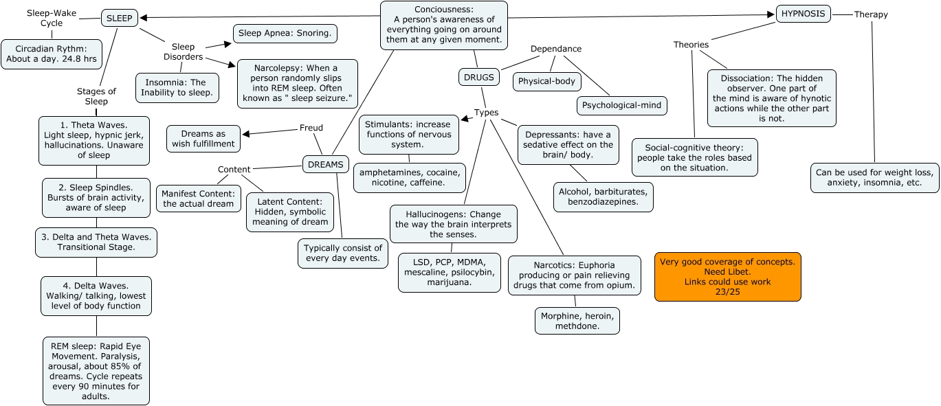 This Concept Map, created with IHMC CmapTools, has information related to: Kyla Parker, Ch. 4 23, SLEEP Stages of Sleep REM sleep: Rapid Eye Movement. Paralysis, arousal, about 85% of dreams. Cycle repeats every 90 minutes for adults., SLEEP Stages of Sleep 1. Theta Waves. Light sleep, hypnic jerk, hallucinations. Unaware of sleep, DRUGS Types Hallucinogens: Change the way the brain interprets the senses., Conciousness: A person's awareness of everything going on around them at any given moment. ???? SLEEP, Conciousness: A person's awareness of everything going on around them at any given moment. ???? HYPNOSIS, DREAMS Content Manifest Content: the actual dream, SLEEP Stages of Sleep 4. Delta Waves. Walking/ talking, lowest level of body function, Conciousness: A person's awareness of everything going on around them at any given moment. ???? DREAMS, DRUGS Types Narcotics: Euphoria producing or pain relieving drugs that come from opium., DREAMS Content Latent Content: Hidden, symbolic meaning of dream, SLEEP Stages of Sleep 2. Sleep Spindles. Bursts of brain activity, aware of sleep, DRUGS Dependance Psychological-mind, DRUGS Dependance Physical-body, DRUGS Types Stimulants: increase functions of nervous system., SLEEP Sleep-Wake Cycle Circadian Rythm: About a day. 24.8 hrs, Depressants: have a sedative effect on the brain/ body. ???? Alcohol, barbiturates, benzodiazepines., Conciousness: A person's awareness of everything going on around them at any given moment. ???? DRUGS, SLEEP Stages of Sleep 3. Delta and Theta Waves. Transitional Stage., Narcotics: Euphoria producing or pain relieving drugs that come from opium. ???? Morphine, heroin, methdone., Stimulants: increase functions of nervous system. ???? amphetamines, cocaine, nicotine, caffeine.