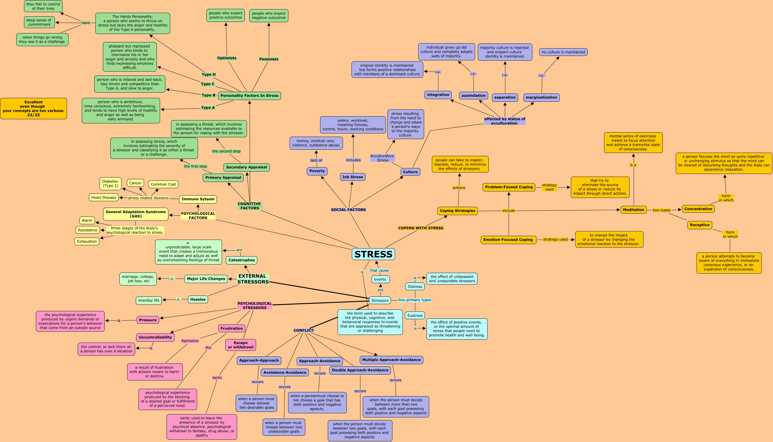 This Concept Map, created with IHMC CmapTools, has information related to: BUCK Chp 11 22, Coping Strategies include Emotion-Focused Coping, Major Life Changes i.e. marriage, college, job loss, etc, STRESS PSYCHOLOGICAL FACTORS General Adaptation Syndrome (GAS), Immune Sytsem stress related diseases Cancer, Stressors CONFLICT Approach-Approach, General Adaptation Syndrome (GAS) three stages of the body's psychological reaction to stress. Exhaustion, Coping Strategies include Problem-Foused Coping, Frustration the psychological experience produced by the blocking of a desired goal or fulfillment of a percieved need., Stressors two primary types Eustress, STRESS PSYCHOLOGICAL FACTORS Immune Sytsem, Distress is the effect of unlpeasant and undesirable stressors, Personality Factors In Stress Pesimists people who expect negative outcomes, Approach-Avoidance occurs when a personmust choose or not choose a goal that has both positive and negative apsects., STRESS COGNITIVE FACTORS Primary Appraisal, Receptive form in which a person attempts to become aware of everything in immediate conscious experience, or an expansion of consciousness., Double Approach-Avoidance occurs when the person must decide bewteen two goals, with each goal posessing both positive and negative aspects., Uncontrollability is the control, or lack there of, a person has over a situation, The Hardy Personality: a person who seems to thrive on stress but lacks the anger and hostility of the Type A personality. have deep sense of commitment, Job Stress includes salary, workload, meaning-fulness, control, hours, working conditions, Problem-Foused Coping strategy used that try to eliminate the source of a stress or reduce its impact through direct actions.