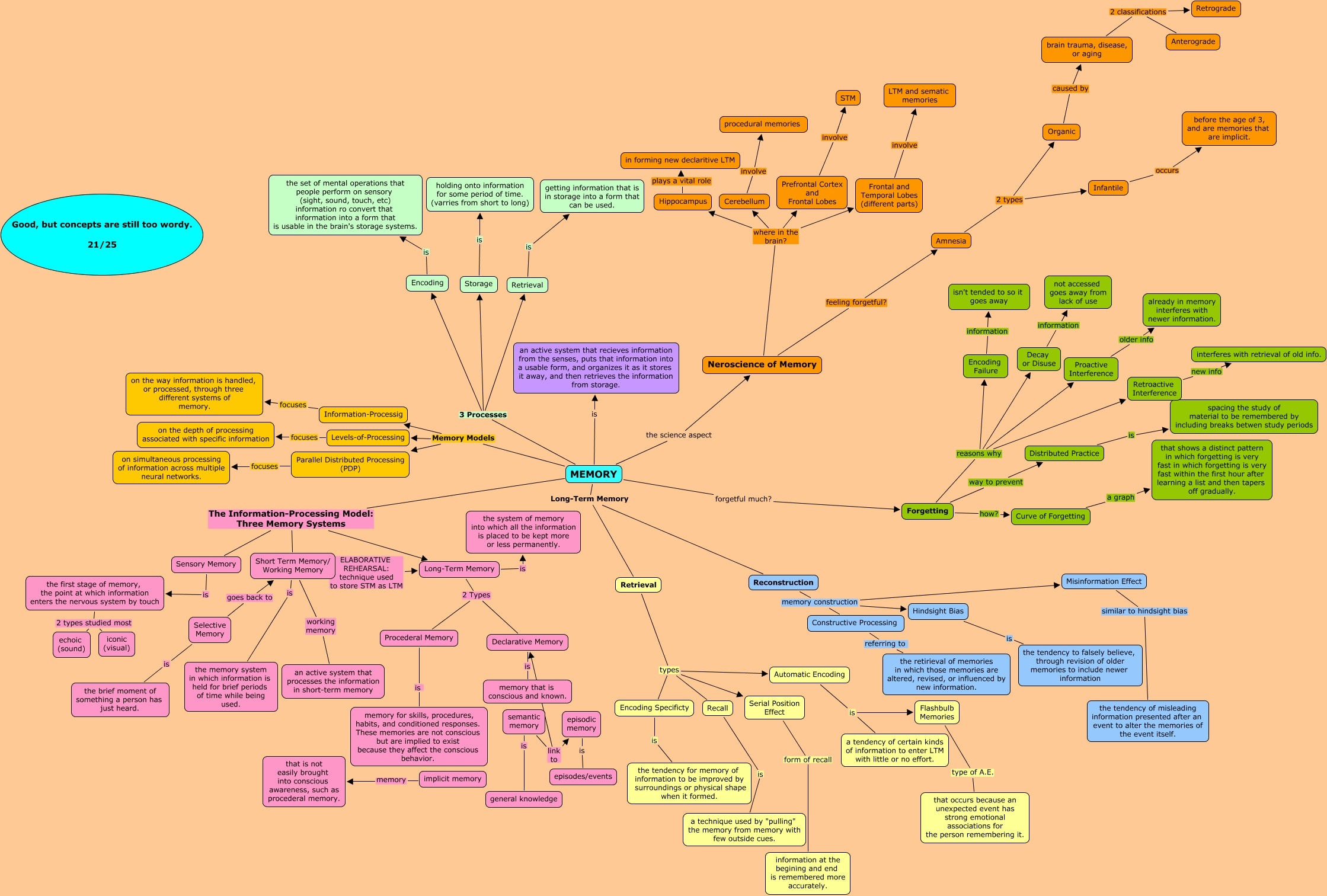 This Concept Map, created with IHMC CmapTools, has information related to: BUCK Chp 6 21, Automatic Encoding is Flashbulb Memories, brain trauma, disease, or aging 2 classifications Retrograde, Encoding Specificty is the tendency for memory of information to be improved by surroundings or physical shape when it formed., Long-Term Memory 2 Types Procederal Memory, Retrieval types Encoding Specificty, MEMORY the science aspect Neroscience of Memory, Decay or Disuse information not accessed goes away from lack of use, MEMORY 3 Processes Encoding, Constructive Processing referring to the retirieval of memories in which those memories are altered, revised, or influenced by new information., Proactive Interference older info already in memory interferes with newer information., Sensory Memory is the first stage of memory, the point at which information enters the nervous system by touch, Misinformation Effect similar to hindsight bias the tendency of misleading information presented after an event to alter the memories of the event itself., Levels-of-Processing focuses on the depth of processing associated with specific information, Serial Position Effect form of recall information at the begining and end is remembered more accurately., Amnesia 2 types Organic, Reconstruction memory construction Constructive Processing, Retrieval types Serial Position Effect, MEMORY is an active system that recieves information from the senses, puts that information into a usable form, and organizes it as it stores it away, and then retrieves the information from storage., Retroactive Interference new info interferes with retrieval of old info., Information-Processig focuses on the way information is handled, or processed, through three different systems of memory.
