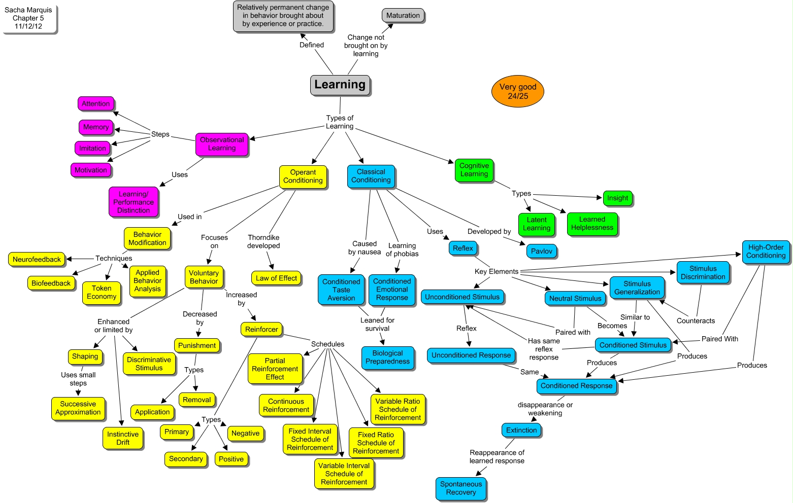 This Concept Map, created with IHMC CmapTools, has information related to: Sacha Marquis Ch5 24, Cognitive Learning Types Latent Learning, Cognitive Learning Types Learned Helplessness, Reinforcer Types Secondary, Reinforcer Schedules Partial Reinforcement Effect, Reinforcer Schedules Fixed Interval Schedule of Reinforcement, Learning Change not brought on by learning Maturation, Learning Types of Learning Classical Conditioning, Conditioned Taste Aversion Leaned for survival Biological Preparedness, Operant Conditioning Used in Behavior Modification, Conditioned Stimulus Has same reflex response Unconditioned Stimulus, Classical Conditioning Learning of phobias Conditioned Emotional Response, Reinforcer Types Positive, Reflex Key Elements High-Order Conditioning, High-Order Conditioning Produces Conditioned Response, Cognitive Learning Types Insight, Neutral Stimulus Paired with Unconditioned Stimulus, Observational Learning Steps Attention, Behavior Modification Techniques Token Economy, Behavior Modification Techniques Applied Behavior Analysis, Unconditioned Response Same Conditioned Response