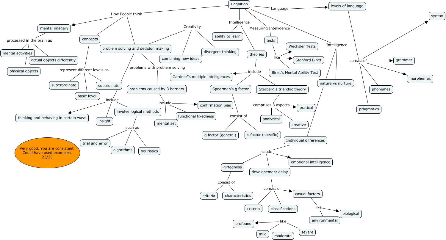 This Concept Map, created with IHMC CmapTools, has information related to: BUCK Chp 7 23, theories include Spearman's g factor, concepts represent diferent levels as basic level, mental imagery processed in the brain as mental activities, casual factors like environmental, developement delay consist of classifications, problem solving and decision making include involve logical methods, problem solving and decision making Creativity combining new ideas, Cognition How People think concepts, tests like Binet's Mental Ability Test, Individual differences include developement delay, levels of language consist of grammer, Cognition Measuring Intelligence tests, Cognition Intelligence Individual differences, developement delay consist of criteria, Cognition Intelligence nature vs nurture, involve logical methods such as heuristics, Cognition Intelligence ability to learn, concepts represent diferent levels as subordinate, Sterberg's triarchic theory comprises 3 aspects pratical, mental imagery processed in the brain as actual objects differently
