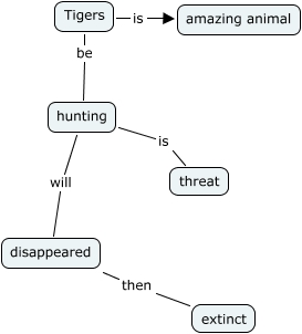 此概念图以 IHMC CmapTools 创建, 内含信息有关于: M10113206 The future of tigers, Tigers is amazing animal, disappeared then extinct, Tigers be hunting, hunting will disappeared, hunting is threat