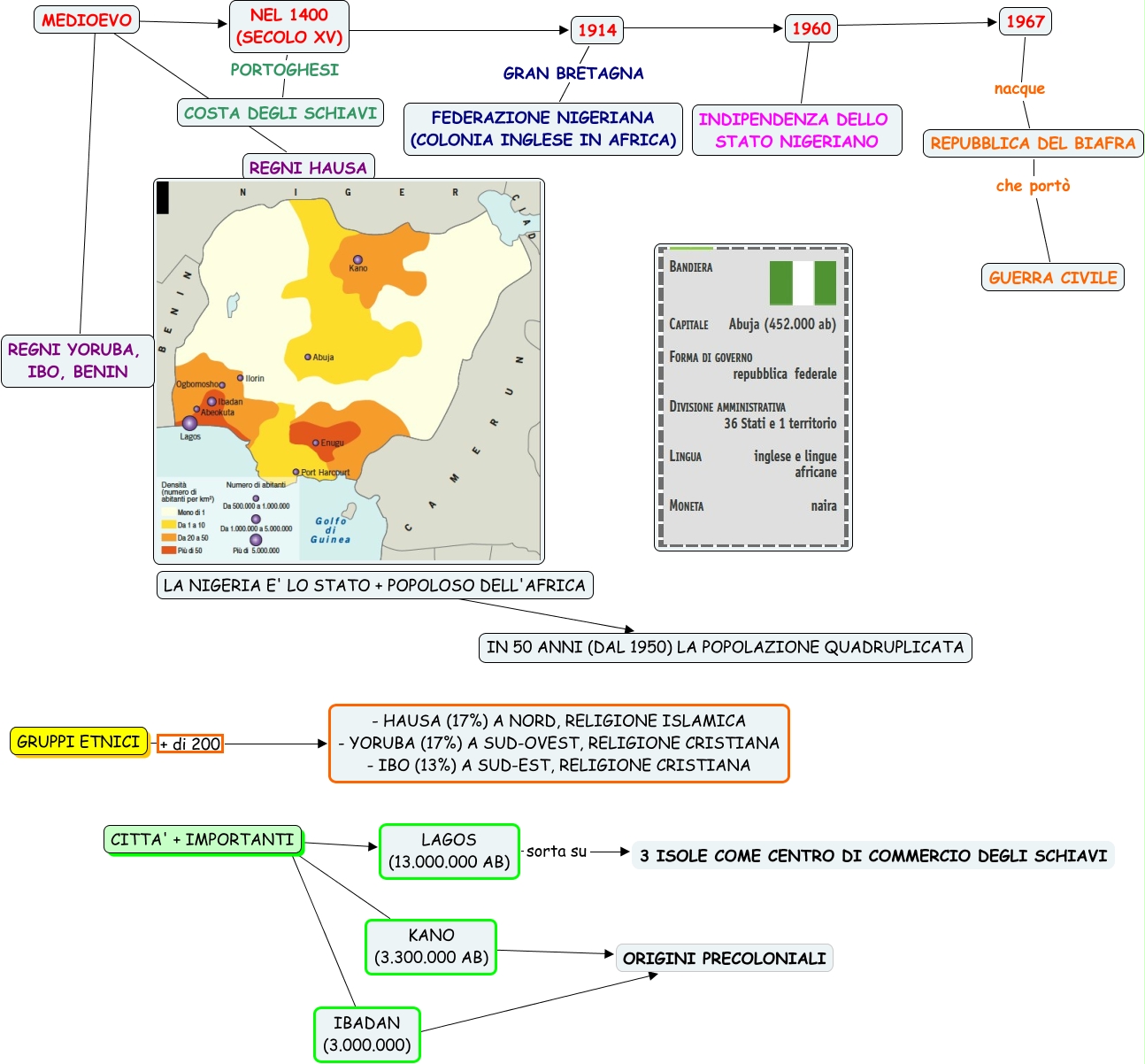 Questa Cmap, creata con IHMC CmapTools, contiene informazioni relative a: NIGERIA 2, 1960 ???? INDIPENDENZA DELLO STATO NIGERIANO, 1960 ???? 1967, MEDIOEVO ???? NEL 1400 (SECOLO XV), 1967 nacque REPUBBLICA DEL BIAFRA, CITTA' + IMPORTANTI ???? KANO (3.300.000 AB), GRUPPI ETNICI + di 200 - HAUSA (17%) A NORD, RELIGIONE ISLAMICA - YORUBA (17%) A SUD-OVEST, RELIGIONE CRISTIANA - IBO (13%) A SUD-EST, RELIGIONE CRISTIANA, CITTA' + IMPORTANTI ???? LAGOS (13.000.000 AB), NEL 1400 (SECOLO XV) ???? 1914, REPUBBLICA DEL BIAFRA che portò GUERRA CIVILE, MEDIOEVO ???? REGNI YORUBA, IBO, BENIN, CITTA' + IMPORTANTI ???? IBADAN (3.000.000), 1914 GRAN BRETAGNA FEDERAZIONE NIGERIANA (COLONIA INGLESE IN AFRICA), NEL 1400 (SECOLO XV) PORTOGHESI COSTA DEGLI SCHIAVI, KANO (3.300.000 AB) ???? ORIGINI PRECOLONIALI, 1914 ???? 1960, LAGOS (13.000.000 AB) sorta su 3 ISOLE COME CENTRO DI COMMERCIO DEGLI SCHIAVI, LA NIGERIA E' LO STATO + POPOLOSO DELL'AFRICA ???? IN 50 ANNI (DAL 1950) LA POPOLAZIONE QUADRUPLICATA, IBADAN (3.000.000) ???? ORIGINI PRECOLONIALI, MEDIOEVO ???? REGNI HAUSA