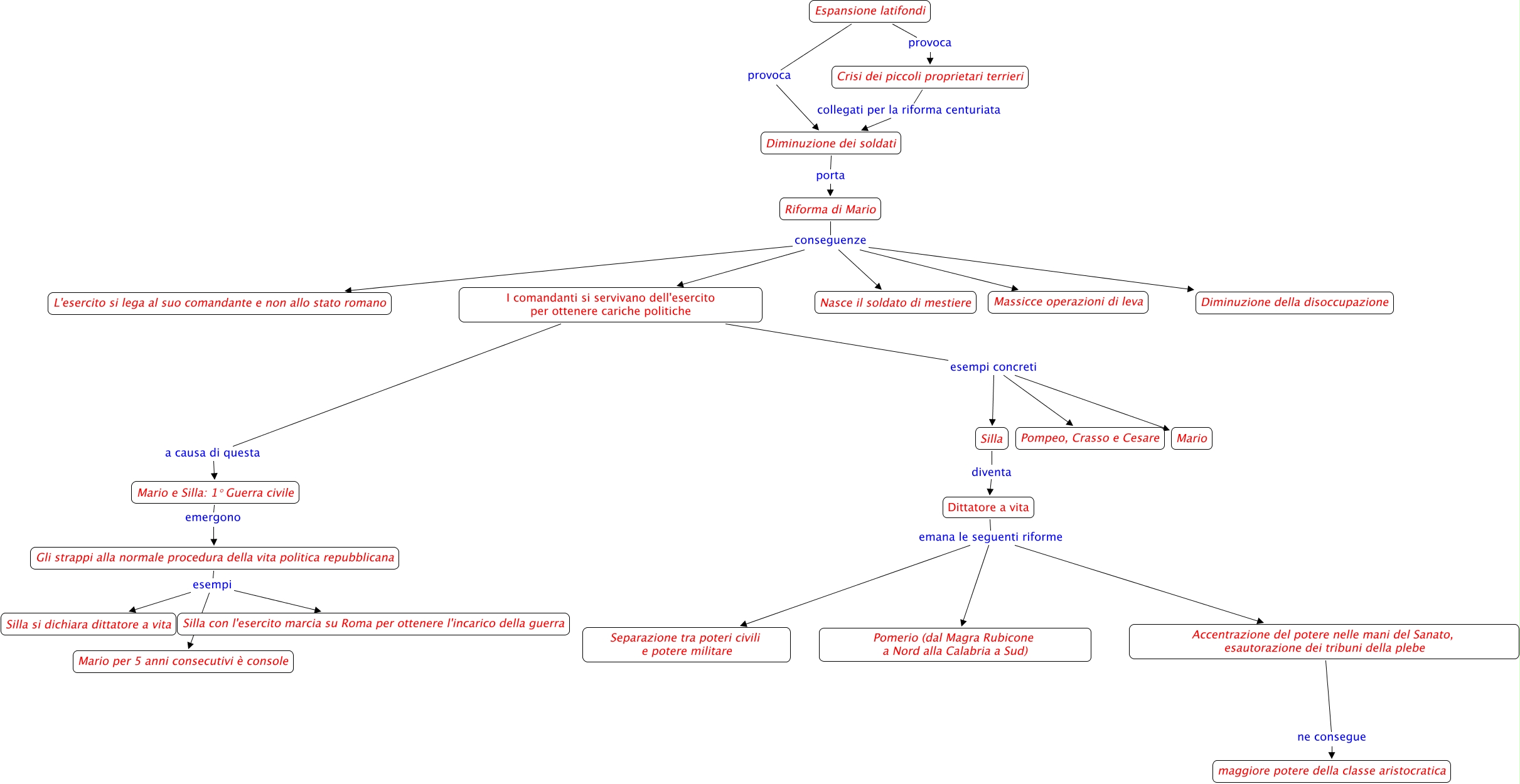 Questa Cmap, creata con IHMC CmapTools, contiene informazioni relative a: CROSI ROMANA DEL III SECOLO AC, Gli strappi alla normale procedura della vita politica repubblicana esempi Silla con l'esercito marcia su Roma per ottenere l'incarico della guerra, Accentrazione del potere nelle mani del Sanato, esautorazione dei tribuni della plebe ne consegue maggiore potere della classe aristocratica, Riforma di Mario conseguenze I comandanti si servivano dell'esercito per ottenere cariche politiche, Riforma di Mario conseguenze L'esercito si lega al suo comandante e non allo stato romano, Riforma di Mario conseguenze Diminuzione della disoccupazione, Espansione latifondi provoca Crisi dei piccoli proprietari terrieri, Riforma di Mario conseguenze Nasce il soldato di mestiere, Crisi dei piccoli proprietari terrieri collegati per la riforma centuriata Diminuzione dei soldati, Dittatore a vita emana le seguenti riforme Pomerio (dal Magra Rubicone a Nord alla Calabria a Sud), I comandanti si servivano dell'esercito per ottenere cariche politiche esempi concreti Silla, Gli strappi alla normale procedura della vita politica repubblicana esempi Mario per 5 anni consecutivi è console, Dittatore a vita emana le seguenti riforme Accentrazione del potere nelle mani del Sanato, esautorazione dei tribuni della plebe, Diminuzione dei soldati porta Riforma di Mario, I comandanti si servivano dell'esercito per ottenere cariche politiche esempi concreti Mario, I comandanti si servivano dell'esercito per ottenere cariche politiche a causa di questa Mario e Silla: 1° Guerra civile, Dittatore a vita emana le seguenti riforme Separazione tra poteri civili e potere militare, Gli strappi alla normale procedura della vita politica repubblicana esempi Silla si dichiara dittatore a vita, Silla diventa Dittatore a vita, Riforma di Mario conseguenze Massicce operazioni di leva, Mario e Silla: 1° Guerra civile emergono Gli strappi alla normale procedura della vita politica repubblicana