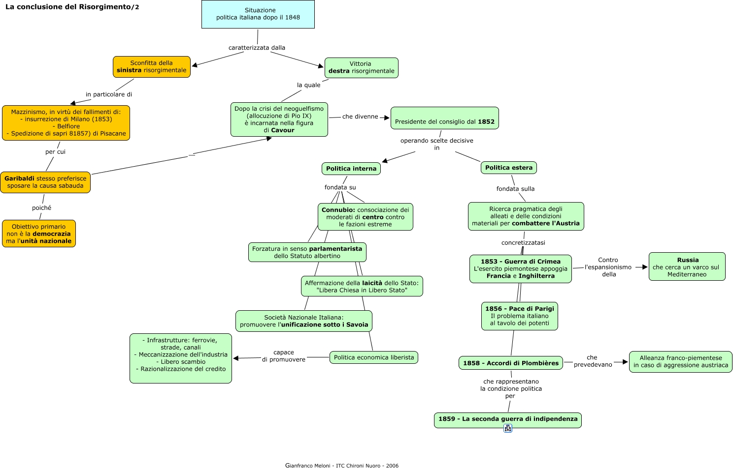 Questa Cmap, creata con IHMC CmapTools, contiene informazioni relative a: unificazione_italiana_2, 1858 - Accordi di Plombières che prevedevano Alleanza franco-piementese in caso di aggressione austriaca, Ricerca pragmatica degli alleati e delle condizioni materiali per combattere l'Austria concretizzatasi 1853 - Guerra di Crimea L'esercito piemontese appoggia Francia e Inghilterra, Garibaldi stesso preferisce sposare la causa sabauda ... Dopo la crisi del neoguelfismo (allocuzione di Pio IX) è incarnata nella figura di Cavour, Situazione politica italiana dopo il 1848 caratterizzata dalla Vittoria destra risorgimentale, Politica interna fondata su Politica economica liberista, Ricerca pragmatica degli alleati e delle condizioni materiali per combattere l'Austria concretizzatasi 1858 - Accordi di Plombières, Dopo la crisi del neoguelfismo (allocuzione di Pio IX) è incarnata nella figura di Cavour che divenne Presidente del consiglio dal 1852, Politica interna fondata su Società Nazionale Italiana: promuovere l'unificazione sotto i Savoia, Mazzinismo, in virtù dei fallimenti di: - insurrezione di Milano (1853) - Belfiore - Spedizione di sapri 81857) di Pisacane per cui Garibaldi stesso preferisce sposare la causa sabauda, Politica estera fondata sulla Ricerca pragmatica degli alleati e delle condizioni materiali per combattere l'Austria, Ricerca pragmatica degli alleati e delle condizioni materiali per combattere l'Austria concretizzatasi 1856 - Pace di Parigi Il problema italiano al tavolo dei potenti, Garibaldi stesso preferisce sposare la causa sabauda poiché Obiettivo primario non è la democrazia ma l'unità nazionale, 1858 - Accordi di Plombières che rappresentano la condizione politica per 1859 - La seconda guerra di indipendenza, Politica interna fondata su Connubio: consociazione dei moderati di centro contro le fazioni estreme, Garibaldi stesso preferisce sposare la causa sabauda ... Dopo la crisi del neoguelfismo (allocuzione di Pio IX) è incarnata nella figura di Cavour, Sconfitta della sinistra risorgimentale in particolare di Mazzinismo, in virtù dei fallimenti di: - insurrezione di Milano (1853) - Belfiore - Spedizione di sapri 81857) di Pisacane, Politica interna fondata su Affermazione della laicità dello Stato: "Libera Chiesa in Libero Stato", Politica economica liberista capace di promuovere - Infrastrutture: ferrovie, strade, canali - Meccanizzazione dell'industria - Libero scambio - Razionalizzazione del credito, Presidente del consiglio dal 1852 operando scelte decisive in Politica interna, Vittoria destra risorgimentale la quale Dopo la crisi del neoguelfismo (allocuzione di Pio IX) è incarnata nella figura di Cavour