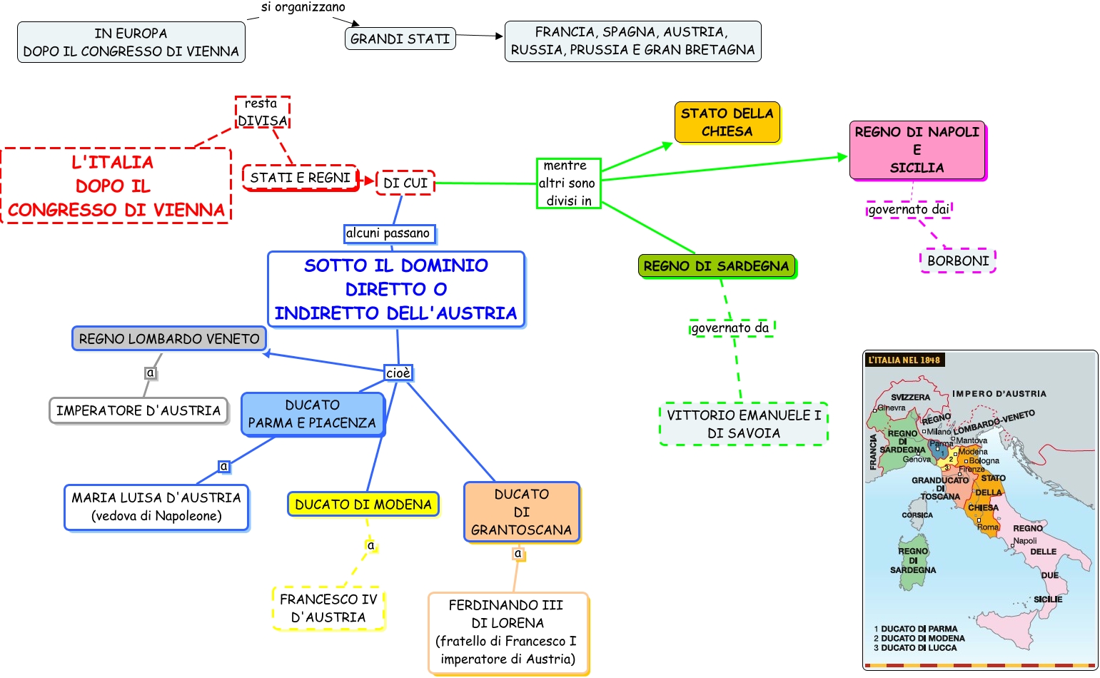 Questa Cmap, creata con IHMC CmapTools, contiene informazioni relative a: UNITA' D'ITALIA 1, DUCATO PARMA E PIACENZA a MARIA LUISA D'AUSTRIA (vedova di Napoleone), L'ITALIA DOPO IL CONGRESSO DI VIENNA resta DIVISA STATI E REGNI, DUCATO DI MODENA a FRANCESCO IV D'AUSTRIA, GRANDI STATI ???? FRANCIA, SPAGNA, AUSTRIA, RUSSIA, PRUSSIA E GRAN BRETAGNA, STATI E REGNI ???? DI CUI, DI CUI mentre altri sono divisi in STATO DELLA CHIESA, DUCATO DI GRANTOSCANA a FERDINANDO III DI LORENA (fratello di Francesco I imperatore di Austria), SOTTO IL DOMINIO DIRETTO O INDIRETTO DELL'AUSTRIA cioè REGNO LOMBARDO VENETO, SOTTO IL DOMINIO DIRETTO O INDIRETTO DELL'AUSTRIA cioè DUCATO PARMA E PIACENZA, DI CUI alcuni passano SOTTO IL DOMINIO DIRETTO O INDIRETTO DELL'AUSTRIA, REGNO LOMBARDO VENETO a IMPERATORE D'AUSTRIA, IN EUROPA DOPO IL CONGRESSO DI VIENNA si organizzano GRANDI STATI, SOTTO IL DOMINIO DIRETTO O INDIRETTO DELL'AUSTRIA cioè DUCATO DI GRANTOSCANA, REGNO DI NAPOLI E SICILIA governato dai BORBONI, SOTTO IL DOMINIO DIRETTO O INDIRETTO DELL'AUSTRIA cioè DUCATO DI MODENA, REGNO DI SARDEGNA governato da VITTORIO EMANUELE I DI SAVOIA, DI CUI mentre altri sono divisi in REGNO DI NAPOLI E SICILIA, DI CUI mentre altri sono divisi in REGNO DI SARDEGNA