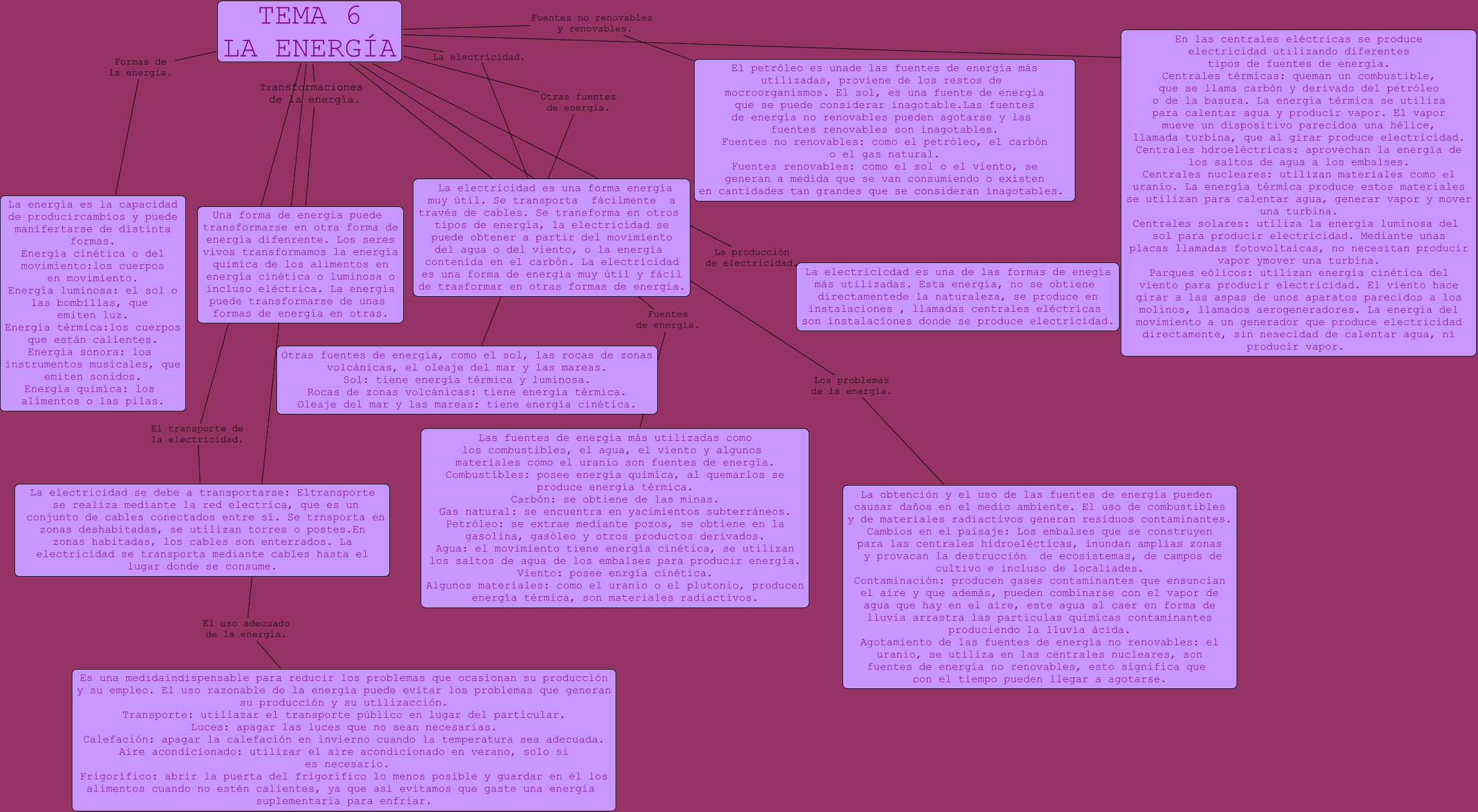Este Cmap, tiene información relacionada con: Lydia Guerra Fernández, TEMA 6 LA ENERGÍA Fuentes de energía. Las fuentes de energía más utilizadas como los combustibles, el agua, el viento y algunos materiales como el uranio son fuentes de energía. Combustibles: posee energía quimíca, al quemarlos se produce energía térmica. Carbón: se obtiene de las minas. Gas natural: se encuentra en yacimientos subterráneos. Petróleo: se extrae mediante pozos, se obtiene en la gasolina, gasóleo y otros productos derivados. Agua: el movimiento tiene energía cinética, se utilizan los saltos de agua de los embalses para producir energía. Viento: posee enrgía cinética. Algunos materiales: como el uranio o el plutonio, producen energía térmica, son materiales radiactivos., TEMA 6 LA ENERGÍA Fuentes no renovables y renovables. El petróleo es unade las fuentes de energía más utilizadas, proviene de los restos de mocroorganismos. El sol, es una fuente de energía que se puede considerar inagotable.Las fuentes de energía no renovables pueden agotarse y las fuentes renovables son inagotables. Fuentes no renovables: como el petróleo, el carbón o el gas natural. Fuentes renovables: como el sol o el viento, se generan a medida que se van consumiendo o existen en cantidades tan grandes que se consideran inagotables., TEMA 6 LA ENERGÍA La producción de electricidad. La electricicdad es una de las formas de enegía más utilizadas. Esta energía, no se obtiene directamentede la naturaleza, se produce en instalaciones , llamadas centrales eléctricas son instalaciones donde se produce electricidad., TEMA 6 LA ENERGÍA Formas de la energía. La energía es la capacidad de producircambios y puede manifertarse de distinta formas. Energía cinética o del movimiento:los cuerpos en movimiento. Energía luminosa: el sol o las bombillas, que emiten luz. Energía térmica:los cuerpos que están calientes. Energía sonora: los instrumentos musicales, que emiten sonidos. Energía quimíca: los alimentos o las pilas., TEMA 6 LA ENERGÍA Otras fuentes de energía. Otras fuentes de energía, como el sol, las rocas de zonas volcánicas, el oleaje del mar y las mareas. Sol: tiene energía térmica y luminosa. Rocas de zonas volcánicas: tiene energía térmica. Oleaje del mar y las mareas: tiene energía cinética., TEMA 6 LA ENERGÍA El uso adecuado de la energía. Es una medidaindispensable para reducir los problemas que ocasionan su producción y su empleo. El uso razonable de la energía puede evitar los problemas que generan su producción y su utilizacción. Transporte: utiliazar el transporte público en lugar del particular. Luces: apagar las luces que no sean necesarias. Calefación: apagar la calefación en invierno cuando la temperatura sea adecuada. Aire acondicionado: utilizar el aire acondicionado en verano, solo si es necesario. Frigorífico: abrir la puerta del frigorífico lo menos posible y guardar en él los alimentos cuando no estén calientes, ya que así evitamos que gaste una energía suplementaria para enfriar., TEMA 6 LA ENERGÍA La electricidad. La electricidad es una forma energía muy útil. Se transporta fácilmente a través de cables. Se transforma en otros tipos de energía, la electricidad se puede obtener a partir del movimiento del agua o del viento, o la energía contenida en el carbón. La electricidad es una forma de energía muy útil y fácil de trasformar en otras formas de energía., TEMA 6 LA ENERGÍA Transformaciones de la energía. Una forma de energia puede transformarse en otra forma de energía difenrente. Los seres vivos transformamos la energía quimíca de los alimentos en energía cinética o luminosa o incluso eléctrica. La energía puede transformarse de unas formas de energía en otras., TEMA 6 LA ENERGÍA Centrales eléctricas. En las centrales eléctricas se produce electricidad utilizando diferentes tipos de fuentes de energía. Centrales térmicas: queman un combustible, que se llama carbón y derivado del petróleo o de la basura. La energía térmica se utiliza para calentar agua y producir vapor. El vapor mueve un dispositivo parecidoa una hélice, llamada turbina, que al girar produce electricidad. Centrales hdroeléctricas: aprovechan la energía de los saltos de agua a los embalses. Centrales nucleares: utilizan materiales como el uranio. La energía térmica produce estos materiales se utilizan para calentar agua, generar vapor y mover una turbina. Centrales solares: utiliza la energía luminosa del sol para producir electricidad. Mediante unas placas llamadas fotovoltaicas, no necesitan producir vapor ymover una turbina. Parques eólicos: utilizan energía cinética del viento para producir electricidad. El viento hace girar a las aspas de unos aparatos parecidos a los molinos, llamados aerogeneradores. La energía del movimiento a un generador que produce electricidad directamente, sin nesecidad de calentar agua, ni producir vapor., TEMA 6 LA ENERGÍA El transporte de la electricidad. La electricidad se debe a transportarse: Eltransporte se realiza mediante la red electrica, que es un conjunto de cables conectados entre sí. Se trnsporta en zonas deshabitadas, se utilizan torres o postes.En zonas habitadas, los cables son enterrados. La electricidad se transporta mediante cables hasta el lugar donde se consume., TEMA 6 LA ENERGÍA Los problemas de la energía. La obtención y el uso de las fuentes de energía pueden causar daños en el medio ambiente. El uso de combustibles y de materiales radiactivos generan residuos contaminantes. Cambios en el paisaje: Los embalses que se construyen para las centrales hidroelécticas, inundan amplias zonas y provacan la destrucción de ecosistemas, de campos de cultivo e incluso de localiades. Contaminación: producen gases contaminantes que ensuncian el aire y que además, pueden combinarse con el vapor de agua que hay en el aire, este agua al caer en forma de lluvia arrastra las partículas quimí