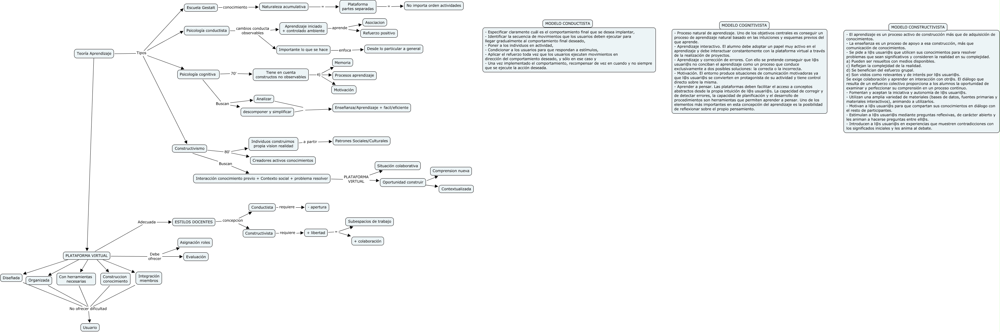 This Concept Map, created with IHMC CmapTools, has information related to: EscVirtual_Confplatdigitales_T5.4, ESTILOS DOCENTES concepcion Constructivista, Teoría Aprendizaje Tipos Escuela Gestalt, ESTILOS DOCENTES concepcion Conductista, Oportunidad construir ???? Comprension nueva, Tiene en cuenta constructos no observables ej Memoria, + libertad = Subespacios de trabajo, Psicología conductista cambios conducta observables Importante lo que se hace, Constructivismo Buscan Interacción conocimiento previo + Contexto social + problema resolver, Naturaleza acumulativa = Plataforma partes separadas, Construccion conocimiento No ofrecer dificultad Usuario, Importante lo que se hace enfoca Desde lo particular a general, Teoría Aprendizaje Tipos Psicología cognitiva, Con herramientas necesarias No ofrecer dificultad Usuario, descomponer y simplificar Enseñanza/Aprendizaje + facil/eficiente, Tiene en cuenta constructos no observables ej Motivación, Integración miembros No ofrecer dificultad Usuario, Constructivismo 80' Individuos construimos propia vision realidad, Escuela Gestalt conocimiento Naturaleza acumulativa, PLATAFORMA VIRTUAL ???? Con herramientas necesarias, Tiene en cuenta constructos no observables ej Procesos aprendizaje