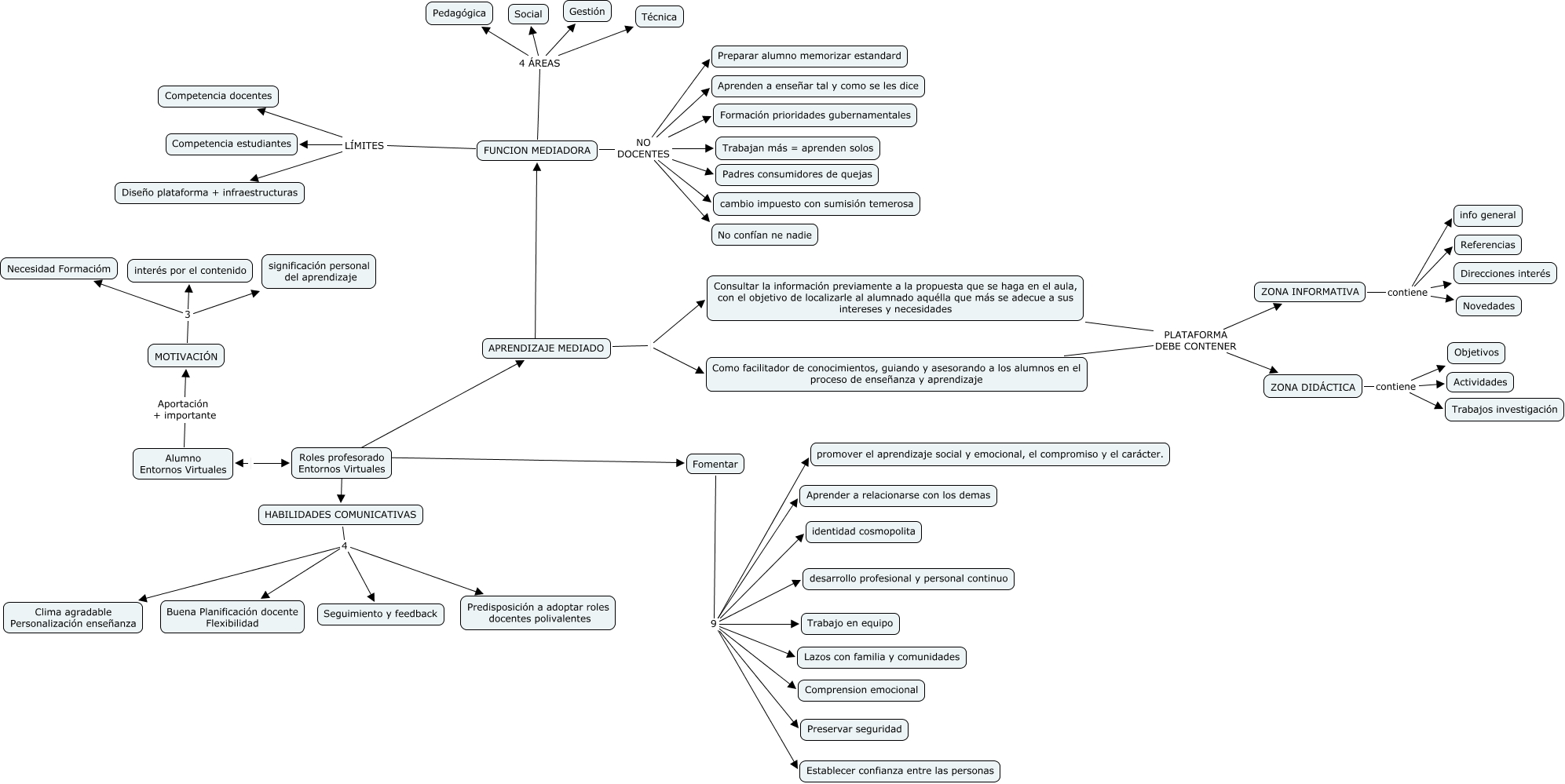This Concept Map, created with IHMC CmapTools, has information related to: EscVirtual_Confplatdigitales_T4.2-T4.2.2, FUNCION MEDIADORA 4 ÁREAS Social, MOTIVACIÓN 3 Necesidad Formacióm, FUNCION MEDIADORA NO DOCENTES Padres consumidores de quejas, APRENDIZAJE MEDIADO ???? FUNCION MEDIADORA, FUNCION MEDIADORA 4 ÁREAS Pedagógica, FUNCION MEDIADORA NO DOCENTES Formación prioridades gubernamentales, ZONA DIDÁCTICA contiene Actividades, FUNCION MEDIADORA LÍMITES Competencia docentes, FUNCION MEDIADORA NO DOCENTES Preparar alumno memorizar estandard, Fomentar 9 Lazos con familia y comunidades, APRENDIZAJE MEDIADO Consultar la información previamente a la propuesta que se haga en el aula, con el objetivo de localizarle al alumnado aquélla que más se adecue a sus intereses y necesidades, Fomentar 9 Trabajo en equipo, Fomentar 9 Establecer confianza entre las personas, HABILIDADES COMUNICATIVAS 4 Predisposición a adoptar roles docentes polivalentes, MOTIVACIÓN 3 significación personal del aprendizaje, Consultar la información previamente a la propuesta que se haga en el aula, con el objetivo de localizarle al alumnado aquélla que más se adecue a sus intereses y necesidades PLATAFORMA DEBE CONTENER ZONA DIDÁCTICA, Como facilitador de conocimientos, guiando y asesorando a los alumnos en el proceso de enseñanza y aprendizaje PLATAFORMA DEBE CONTENER ZONA INFORMATIVA, Fomentar 9 desarrollo profesional y personal continuo, ZONA DIDÁCTICA contiene Objetivos, Roles profesorado Entornos Virtuales ???? HABILIDADES COMUNICATIVAS